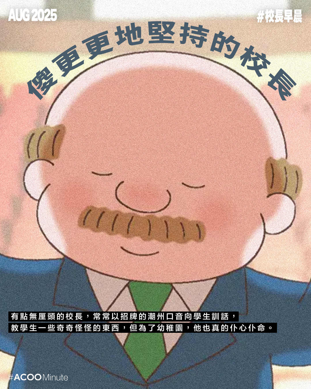 有點無厘頭的校長,常常以招牌的潮州口音向學生訓話,教學生一些奇奇怪怪的東西,但為了幼稚園,他也真的仆心仆命。有集電影講述幼稚園瀕臨倒閉,負債累累,他抱著「得就得,唔得就返順德」的心態,四處打工賺錢,做保安、侍應、炒栗子,甚至累得昏倒,最後想到成立春田花花合唱團出騷賺錢的妙計。校長一直熱愛音樂,希望將音樂的力量帶給小朋友。但他性格腍善,三番四次受騙,幼稚園倒閉了幾次,由冬日鴨鴨、夏日雞雞、秋天蟬蟬做到春田花花,每次他都會想辦法堅持下去,延續他的夢想。