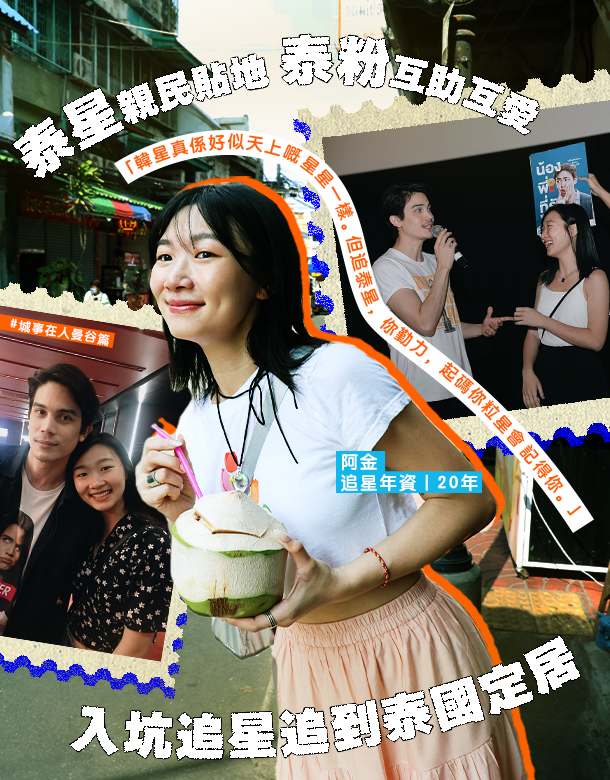 小時候的你,大概都有想過「我的志願」。可是長大後,你與心目中理想生活的距離差了多遠? 今日故事的主角阿金,血液中流着濃濃的「追星血」。中學時從《勁歌金曲》認識韓星Rain開始掉進韓坑,為了追韓星,她讀韓文,夢想做娛記,近距離和偶像交談。但實現夢想後卻漸漸發現,把追星煲劇變成工作與想像原來有出入。與此同時,她掉進「泰坑」和「BL坑」,又跑去學泰文追星。及後發現,自己已深深愛上泰國這地方。 經過一番掙扎後,她不做記者了,反而在泰國曼谷找了一份比香港人工減半的工作,決心留在這個慢活城市。你可能會問值得嗎?回望20年追星生涯,生命的軌跡由舞台閃爍的星星引領,一步一步尋覓自己心之所向,她這樣為30多年的人生總結,同時勸勉同路人:「追星令我變成記者,令我學一個語言,令我學做應援設計,追星令我變成一個更好嘅人。你知道你嘅星畀咗乜嘢快樂你,就已經好足夠!」 文字:Heidi @heidi.is.strong 設計:Kayan @yipyn |追星追到做記者 阿金追星年資已達20年,「小學已經叫媽媽留一蚊畀我抽YES卡,不過嗰陣好單純,只係擁有一件明星產品或者雜誌,我唔覺得嗰啲係追星。」真正讓她開展追星之路的,是Rain。「我好鍾意睇人唱歌跳舞。我唔係睇《浪漫滿屋》入坑,我係睇《勁歌金曲》入坑,哈哈!」 15歲的高中生,雖未財富自由,不能飛到韓國,但因當年紅得如日中天的Rain常常到香港,阿金情願不上學,也會每次到機場接機,連父母也拿她沒轍。在阿金升中五的時候,有次Rain到尖沙咀出席活動,現場很迫,人貼人,「我同Oppa距離好遠。但我見到記者哥哥姐姐唔需要排隊,甚至差唔多活動開始先到現場,仲可以近距離訪問。我見到呢個畫面,我諗,如果我要近距離見到Oppa,似乎我就係要做呢個人?」她遂以浸大傳理為目標,惟會考滑鐵盧。為了讀新聞系,她改到澳洲升學,再到韓國攻讀韓文一年,一心回港後做韓娛記者。 「好好笑嘅係,我讀完後,Rain嗰一年啱啱入伍。不過我覺得唔緊要,我都想做到娛樂記者。」她的第一份工作,便是當年膾炙人口的《YES!》雜誌。 |完成夢想,然後呢? 就這樣,阿金開始了娛樂記者生涯。做過數間媒體的她,最當紅的韓星,例如「四大天王」金秀賢、李鐘碩、金宇彬、李敏鎬;韓團「Beast」、「B.A.P」、「After School」、「FT Island」等都訪問過了;大型頒獎典禮「MAMA」也採訪過,夠圓滿了吧?「但原來當你將樂趣變成工作,係咪真係一件好事呢?當年追星睇劇,係為咗開心,好放鬆;但當你返呢份工,睇劇係為咗打幾千字稿,呢個就已經變成一個負擔。」 在這段低迷時期,阿金從泰星中得到了新的救贖,「嗰陣返緊上一份工,意外見到泰版《浪漫滿屋》,其實以前都會睇泰國電影,《人妖打排球》、《拳霸》,呢啲好老土嘅。嗰陣心諗,泰版浪漫滿屋係咪好似Tony Jaa咁?你竟然翻拍我Oppa嘅劇,我就睇吓你點!」怎料一開劇,驚為天人,「原來泰仔好靚仔!」 自此之後,阿金開始對泰國影視作品著迷,看過了笑片《我很好