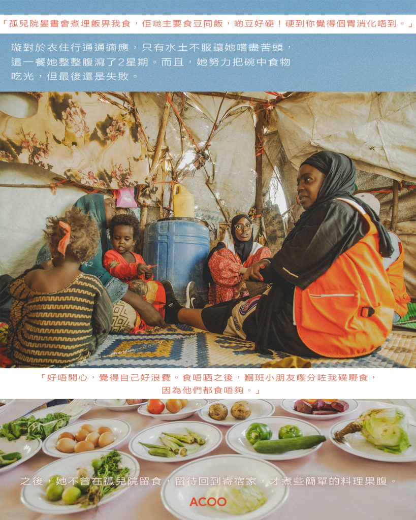 這4個月,璇寄宿在當地人的家,環境像廉租屋,算不過不失,「係停電囉,到依家都仲停緊,一落雨就停電㗎喇!」線上訪問時,璇因停電而中斷了一分多鐘。要數整趟旅程中最難適應的,莫過於水土不服,當時璇整整腹瀉了2星期,「孤兒院晏晝會煮埋飯畀我食,佢哋主要食豆同飯,啲豆好硬!硬到你覺得個胃消化唔到。」雖然盡力把碗中食物吃光,但最後還是失敗,璇說:「好唔開心,覺得自己好浪費。食唔晒之後,嗰班小朋友嚟分咗我碟嘢食,因為他們都食唔夠。」之後,她不曾在孤兒院留食,留待回到寄宿家,才煮些簡單的料理果腹。
