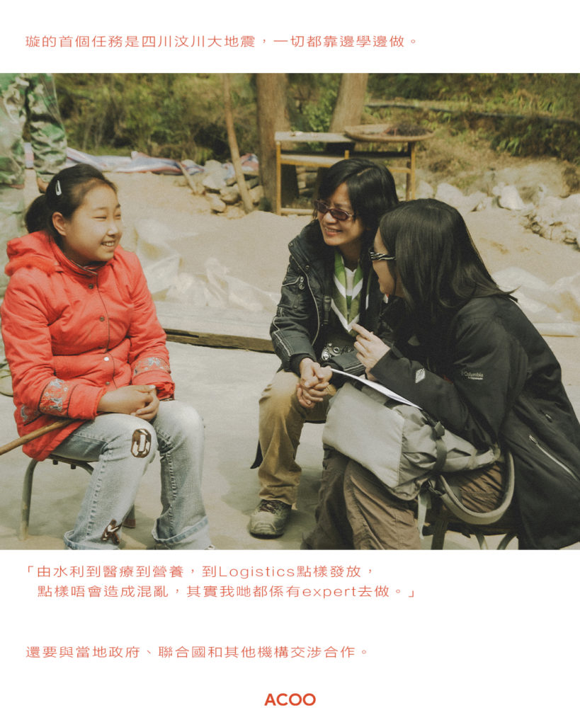 所謂救災(Disaster Management),是不是在瓦爍中尋找生還者?璇笑指曾有人這樣問她,的確有這個崗位,但不是她。璇的首個任務是2008年的汶川大地震,回憶當時拿着一張單程機票便出發,「開始嘅時候好想死㗎,上司都忙得好交關,基本上冇時間教你。」只能邊學邊做,現場所有物資派發也需按照國際準則,璇舉例糧食需考慮營養、災民的飲食習慣,帳篷的大小和設置如何避免火災,「由水利到醫療到營養,到Logistics點樣發放,點樣唔會造成混亂,其實我哋都係有expert去做。」還要與當地政府、聯合國和其他機構交涉合作,「一日可能做12、13個鐘,連weekend,所有嘢都急,永遠都做唔完,大家都好似一息尚存咁。」這場災,足足救了4年。之後,璇又去了被強烈颱風海燕破壞的菲律賓災區及尼泊爾地震災區。
