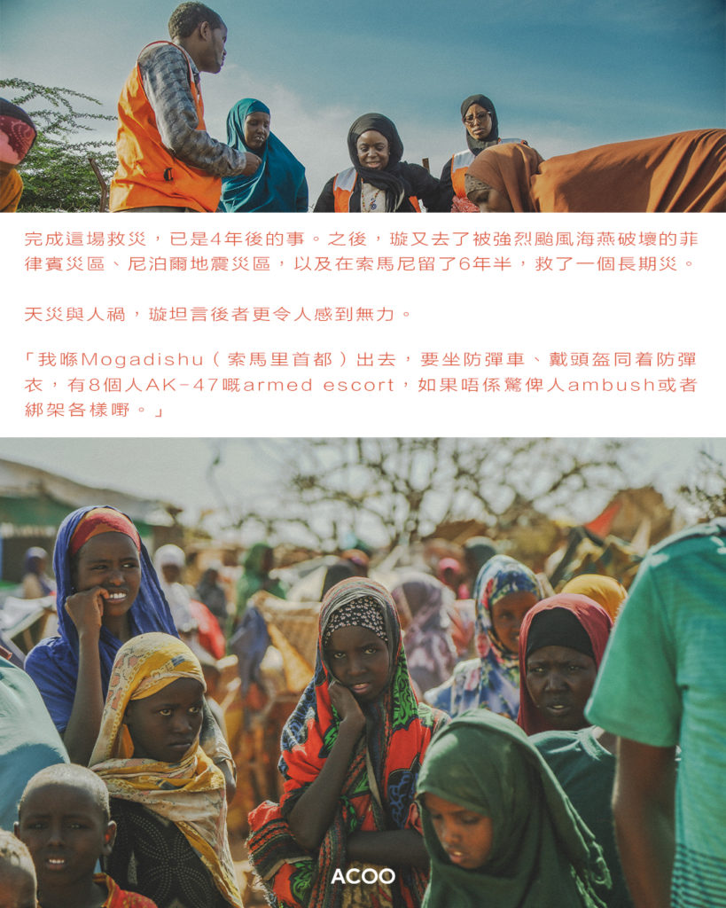 不過,對比起天災,人禍的救災工作更困難,「戰爭、衝突令救援好艱難,因為牽涉太多人的利益,同埋人性。」雙方不停火,救援團隊能做的不多。璇申請調職至全球緊急救援隊前,曾經在索馬里進行長期救災,「我喺Mogadishu(索馬里首都)出去,要坐防彈車、戴頭盔同着防彈衣,有8個人AK-47嘅armed escort,如果唔係驚俾人ambush或者綁架各樣嘢。」六年半的時間,讓她面對槍聲時,即使心中仍有害怕,也不會再大驚小怪。