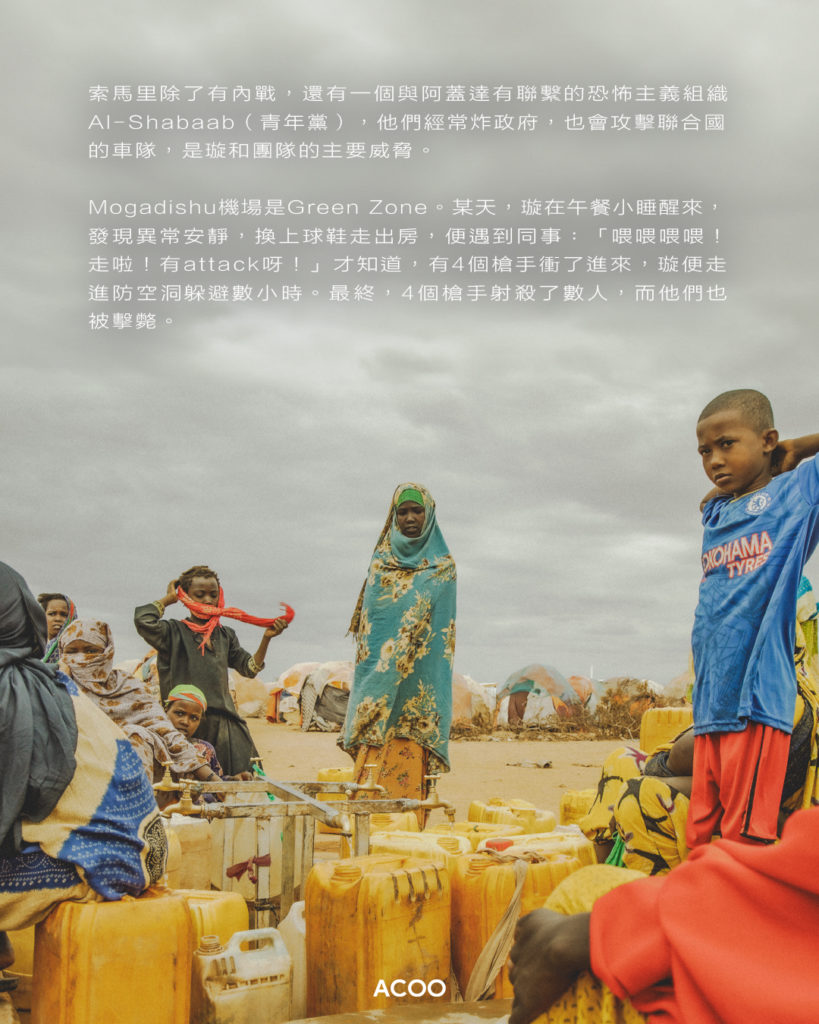 有一次,璇同事收到青年黨的電話,對方只抛下當天訪客的名字,「佢想話畀你知,我知你哋做緊乜,你哋醒醒定定呀。」又一次,Mogadishu機場因有外國領事館及聯合國辦公室,有重軍駐守盡量確保安全,故稱之為Green Zone。某天,璇在午餐後小睡,醒來發現異常安靜,便換上球鞋走出房,便遇到同事:「喂喂喂喂!走啦!有attack呀!」才知道,有4個槍手衝了進來,璇便走進防空洞躲避數小時。最終,4個槍手射殺了數人,而他們也被擊斃。璇的語調輕鬆平常得像討論天氣,她說曾在住處聽到爆炸聲,走出去約在100、200米範圍外看到小型蘑菇雲,「做呢行做得耐有少少變態。」