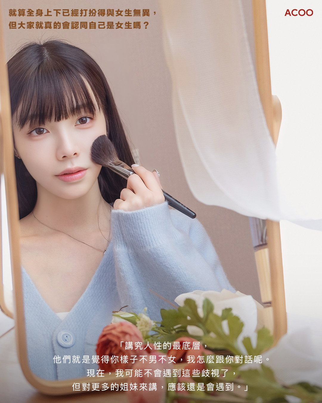 就算全身上下已經打扮得與女生無異,但大家就真的會認同自己是女生嗎?「我未完成變性手術前,曾經接過一個通告(拍攝邀請),當我到節目組那邊,看到我身分證,他們向我說,我們要找的是真的女生,不是你這種,請你離開。」愛里有感社會對於跨性別有很大的恐懼,而那恐懼名為「覺得你不男不女」。愛里舉例,以前傳統電視節目喜歡把跨性別當成「道具」、「叫你猜猜哪一個是男生」,「就是這種感覺,讓大家對於跨性別的既定印象就是一個笑柄、腥羶色。」