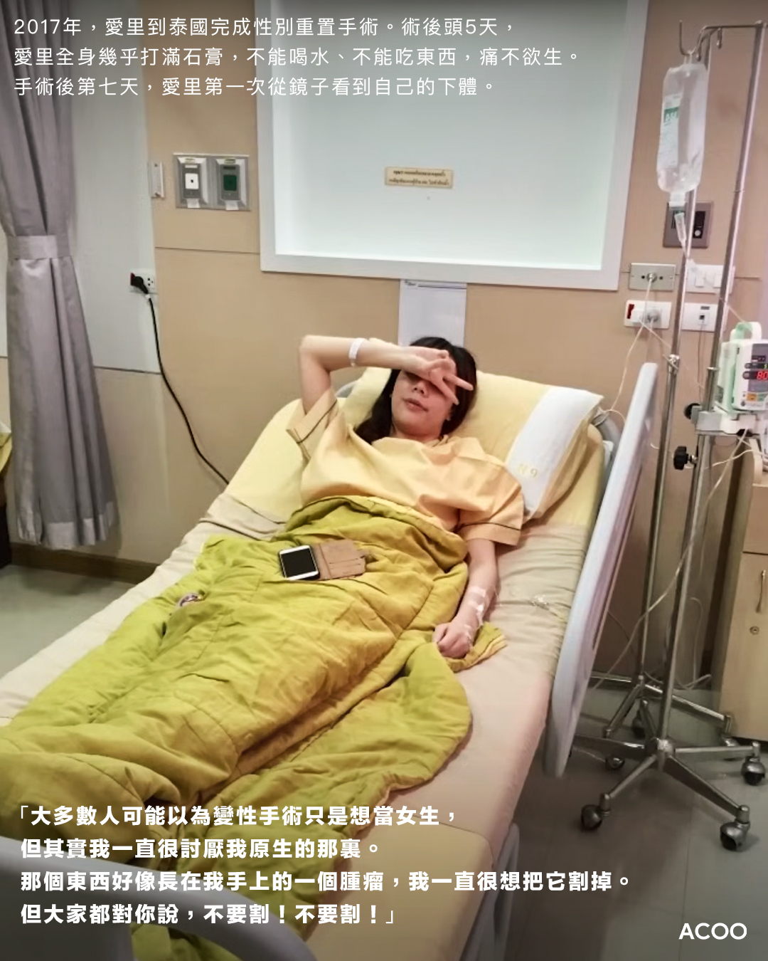 但她不管了。愛里在2015年上了台灣知名綜藝節目《康熙來了》,分享自己作為跨性別人士的心路歷程,增加了知名度,也成了打開了媽媽理解自己的契機。其後,她開始服用荷爾蒙,並於兩年後(2017年)到泰國完成男跨女的性別重置手術。愛里手術後疼痛非常,但那種期待遠大於恐懼。手術後頭5天,愛里全身幾乎打滿石膏,不能喝水、不能吃東西,與此同時又要被強迫嘗試行走,痛不欲生。但到第七天,愛里第一次從鏡子看到自己的下體,「大多數人可能以為變性手術只是想當女生,但其實我一直很討厭我原生的那裏。那個東西好像長在我手上的一個腫瘤,我一直很想把它割掉。但大家都對你說,不要割!不要割!」