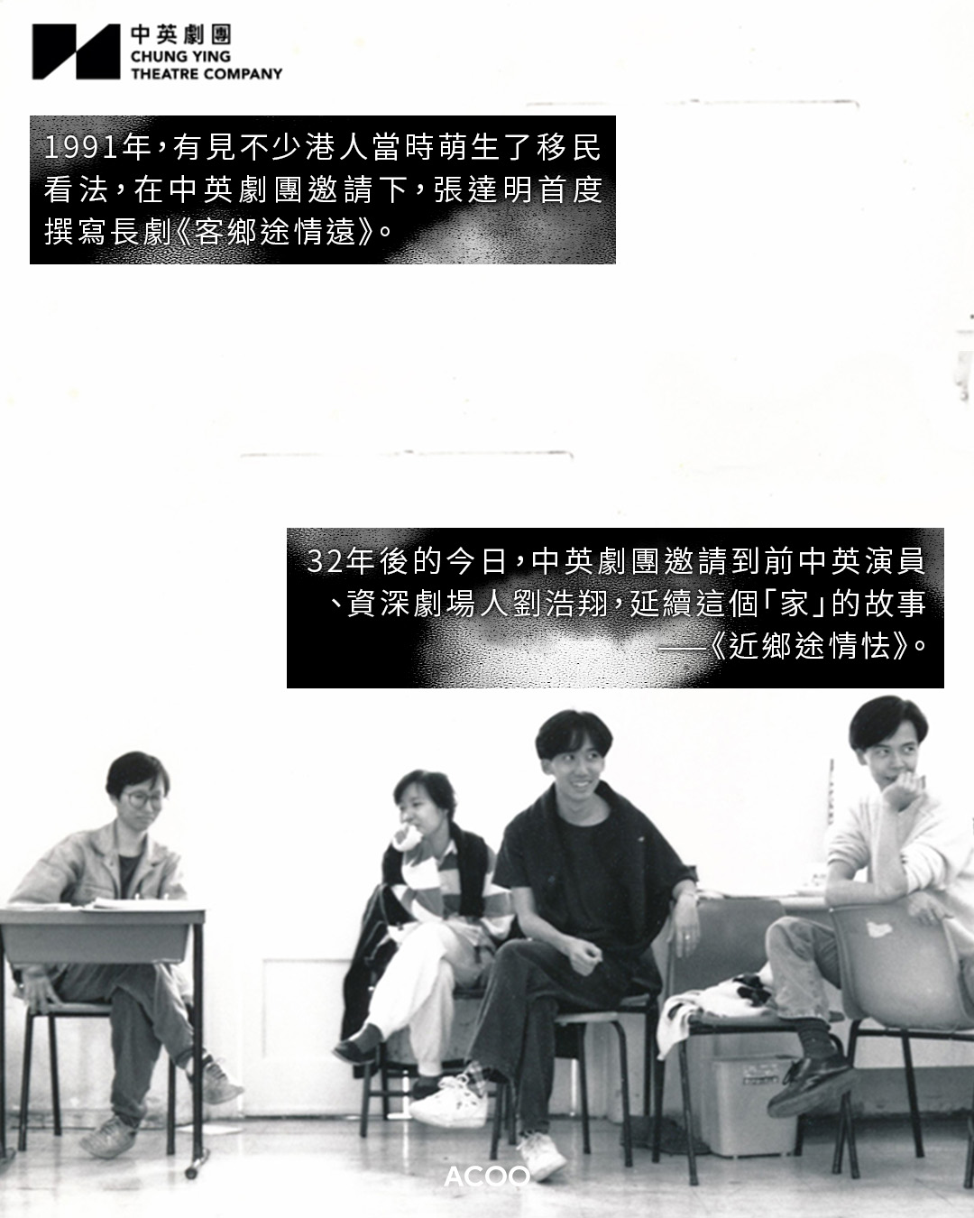 1991年,有見不少港人當時萌生了移民看法,在中英劇團邀請下,張達明首度撰寫長劇《客鄉途情遠》。這個故事以喜劇手法描寫長子阿德移民加國、幼子阿偉留港發展、父親俊叔回鄉再娶,一家流散於三地。首度自編自導的他,憑此劇勇奪第一屆舞台劇獎最佳編劇及最佳導演。32年後的今日,中英劇團邀請前中英演員、資深劇場人劉浩翔,延續這個「家」的故事——《近鄉途情怯》。於是,兩位創作人宛如進行了隔空30年的時空交流。