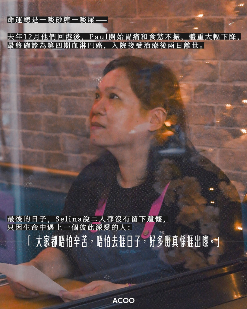 命運總是一啖砂糖一啖屎。回港後,即去年12月,Paul開始胃痛和食慾不振,體重大幅下降,曾三次到醫院求醫。初時,醫生診斷為胰腺炎,之後懷疑是癌症,最終斷症為肝癌。確診後,還沒有傷心的時間,Selina便帶着Paul向肝臟專科醫生求診,又做了不同的化驗,才發現Paul真正患上的是第四期血淋巴癌,他們便決定入院接受治療。不幸的是,2天後Paul便離世,很是眼淺的Selina努力在訪問期間控制情緒,但瀕臨失控的嗓音和不斷滾落的眼淚背叛了她,「佢走嗰刻我有流眼淚,但都冇依家咁激動,因為佢真係解脫咗,後尾佢真係好辛苦好辛苦,到最後真係瘦咗好多。」