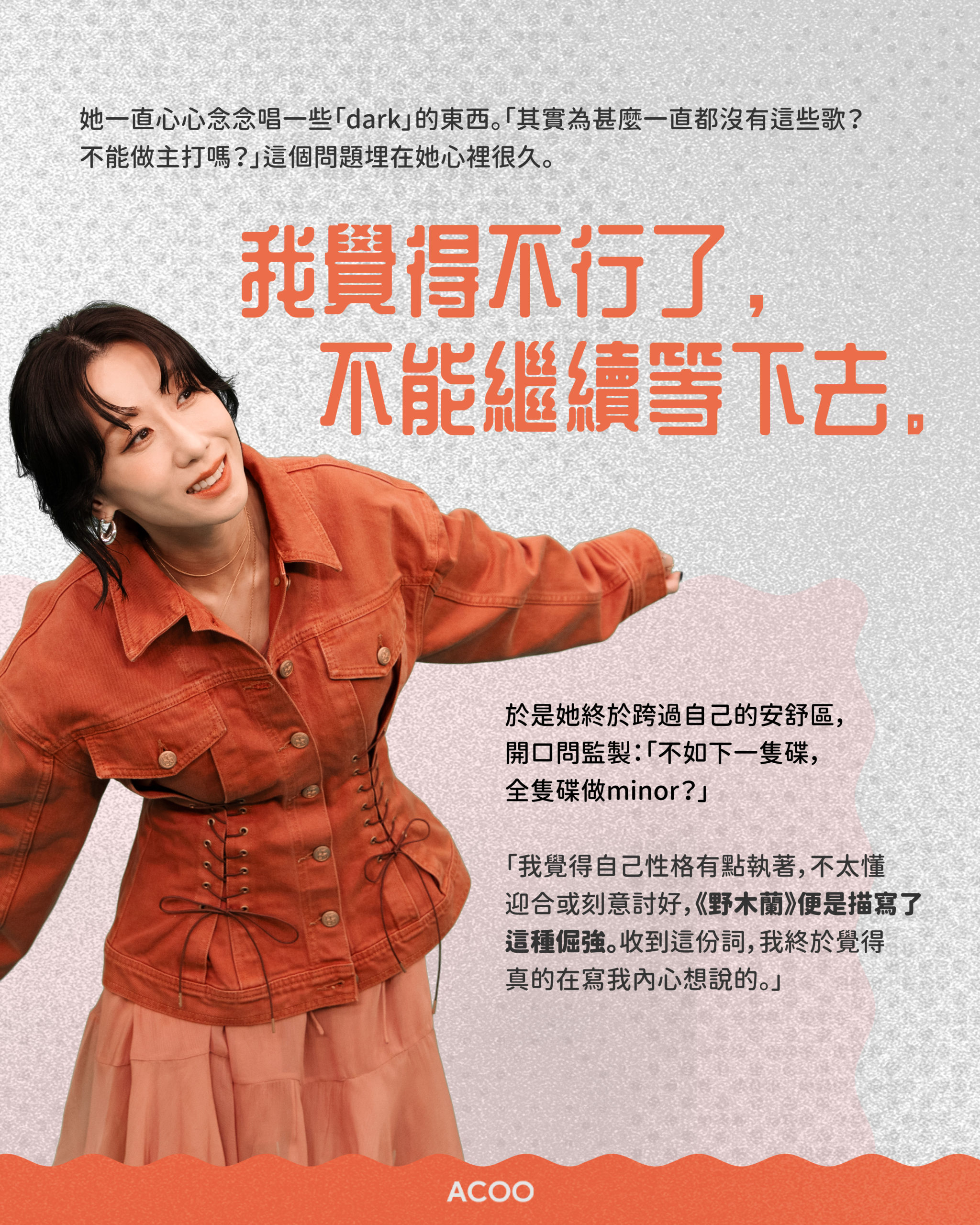 在訪問前兩日的簽唱會上,發生了這樣的一幕:Kiri T正在和歌迷們玩猜歌名遊戲,但她在台上看著題目,腦袋卻一片空白,緊張得手忙腳亂,最後竟然連自己作品的名字都忘了。事後回想,她忍不住自嘲:「明明係好簡單嘅嘢,但我好似好Kam咁⋯⋯大家話『嘩,你記性,真~係好差喎』。我都話,我可能要食啲合桃補腦⋯⋯」 如果這種尷尬與焦慮是你曾有過的共鳴,那麼她即將在澳門舉辦的演唱會《Hello Introvert》,或許就是為你而設的一個「安全出口」。在這個演唱會,她邀請各位「I」人可以放心自己一個前來,被音樂治癒:「例如我都係一個唔擅於表達自己嘅人,或者有好多嘢唔敢講。但我希望呢個演唱會可以話畀大家聽——即使我哋性格咁迴避,但我哋都值得被了解、能夠被了解。」 「我依家都會embrace自己咁Kam。」Kiri T笑說。 採訪:Heidi @heidi.is.strong 攝影:Andrew @andrew_bangchan 設計:Larry @ialyrral_ |不需要「被迫營業」的安全空間 對於很多 I 人來說,看演唱會往往伴隨著一種無形的壓力——害怕被要求站起來跳舞、害怕要表現得 High、害怕要一同高聲歌唱。「Hello Introvert」,是一個讓「I」人感到安全、舒適、自在的空間:「呢度唔會有好多機關或者娛樂,唔會叫大家要好雀躍起身。我會形容係好chill,想講嘢就講嘢,想唱歌就唱歌嘅形式。」 Kiri T這樣解讀「I」這回事:「其實I人都想要connection,只不過我哋嘅friendship要好exclusive,好gentle。我哋都鍾意好近,但可能係好近、輕輕咁講安慰你嘅說話。」這次,她希望在澳門百老匯舞台創造一個「Safe Space」,並正在探索各種適合內向者的「距離」。她又透露在歌曲選擇上希望營造一些「contrast」:「例如大家以為呢隻歌要好大力,其實可以好細力?或者以為呢隻歌好細力,其實原來可以好大力?因為對我嚟講,大家可能會誤會I人好冷漠,但可能我哋心底有好多嘢想講,只係怕打擾人哋。所以我都好想探索一下contrast呢個主題。」 |和自己的「I」來一場和解 「大概幾年前,我成日會同朋友講,如果我E啲就好啦。因為每次上台都覺得好吃力,每次訪問都會好甩咳。以前我做音樂節目,我知道見到唔識嘅人,我會預早3、4個鐘冷靜,聽meditation嘅歌,『咚~』嗰啲。」 舊作《icouldusealittlehelp》裡的一句歌詞:「Why do I pretend again and again, that I'm stronger than I am?(為何我一再假裝自己比想像中強悍?)」,正正道出她從前漫長的自我拉扯。 這幾年香港人對 MBTI 、「I」與「E」的討論多了,社會也開始對「I」多了一份理解,「某程度上時代都幫咗我。」再後來,她發現自己的聽眾都與自己面對同一種困境:「佢哋都會話喺社會好大壓力,唔夠E。反而因為我企出嚟就係咁Kam,好多歌迷會同我分享,原來我啲歌會令佢哋覺得被了解,咁我都覺得呢件事好療癒。」 早些日子派台的《我可能是迴避型》,講的正是害怕踏前一步的這種情緒。若然因為自己掙扎或卻步,而錯過一些機會甚至一些關係,不會很可惜嗎?Kiri T則這樣認為:「如果因為你I而錯過一啲關係,可能呢個都未必係你想要嘅關係。」最重要的,是認清自己想要的是甚麼。 所以,Kiri T希望這場《Hello Introvert》演唱會,不只是一場演出,更像是一次「同類」的聚會。「我覺得唔需要有壓力去invite人、約人一齊。因為你哋已經約咗我,我已經約咗你哋啦!I’ll see you there!」 Makeup: @tammyau_makeup Hair: @jamieleehair @issac_lo @hola.hair.pets In ACOO, you
