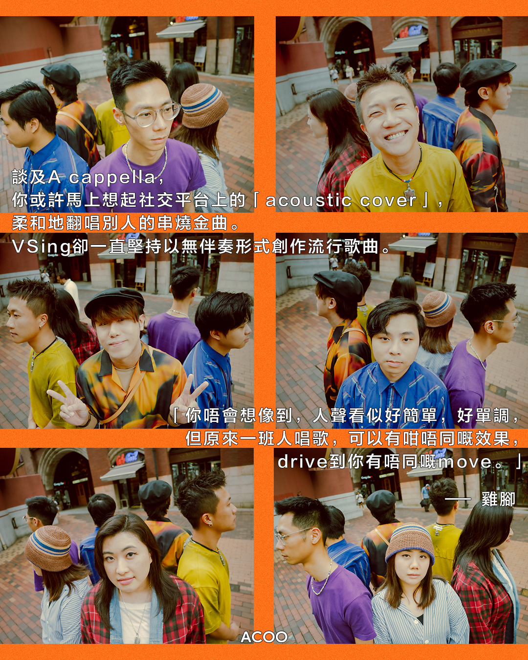 談及A cappella,你或許馬上想起社交平台上的「acoustic cover」,柔和地翻唱別人的串燒金曲。VSing卻一直堅持以無伴奏形式創作流行歌曲。節奏口技雞腳說:「我啲阿叔,或者年紀大嘅人都會覺得,成班人(A cappella)嘰哩咕嚕,唔知做乜⋯⋯以往(大眾嘅)想法係,覺得A cappella好靜,但其實A cappella都可以好爆。」