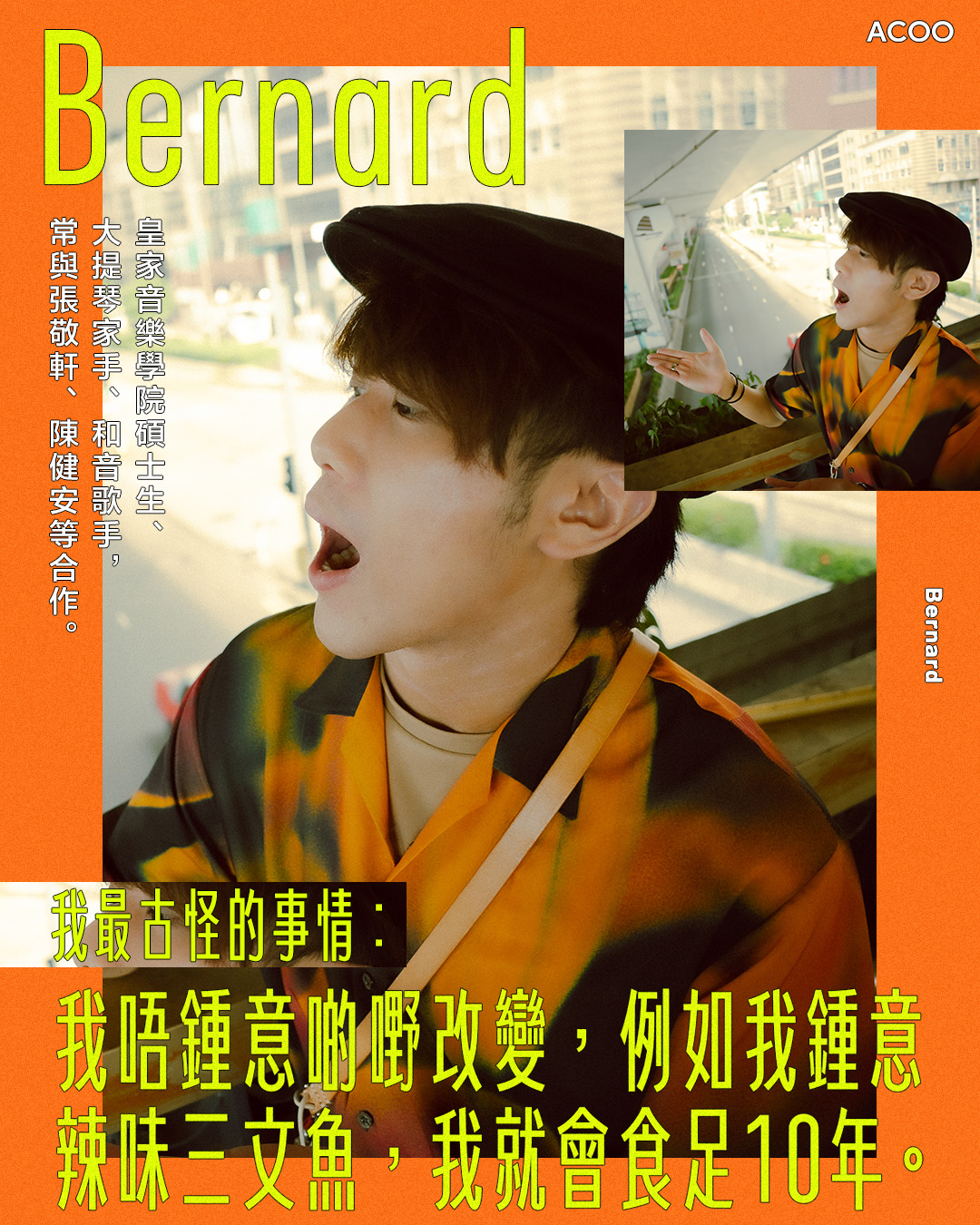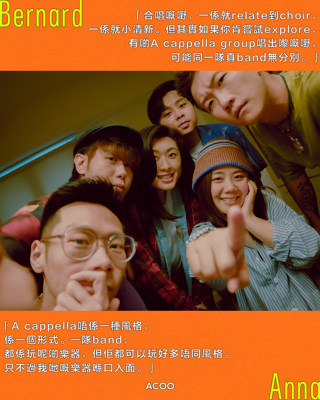 Bernard亦是被A cappella純粹的人聲表達吸引。但他卻不視A cappella為「讓自己著迷」的事情,反倒是一種「耐力的訓練」,「唔係每一刻都好enjoy,因為實在有太多嘢阻住大家進步。例如大家會忙,大家有唔同諗法。六個人要向住同一個目標進發,係超級難嘅事。所以我哋彩排,要一齊搵大家嘅共鳴位。呢個係A cappella最特別嘅地方。」