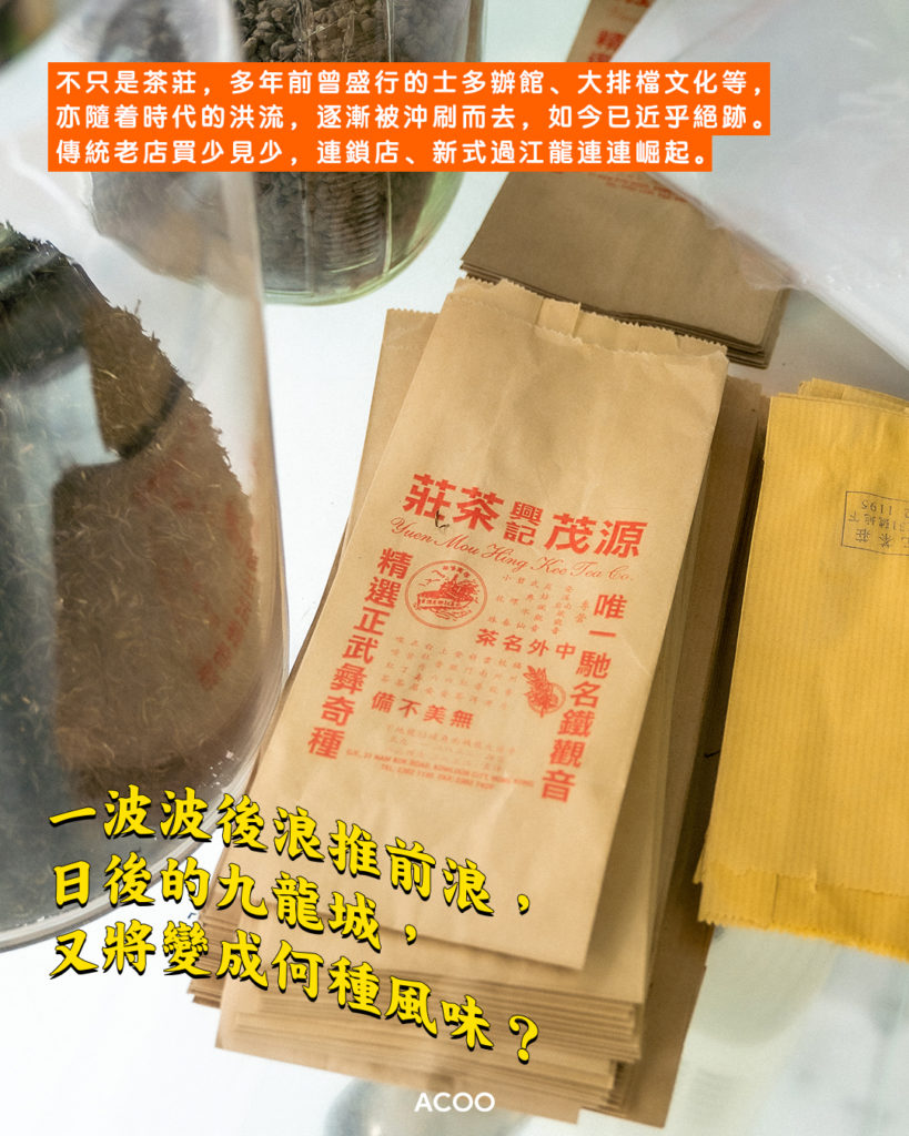 不只是茶莊,多年前曾盛行的士多辦館、大排檔文化等,亦隨着時代的洪流,逐漸被沖刷而去,如今已近乎絕跡。如鞋行、茶莊般的傳統老店買少見少,連鎖店、新式過江龍連連崛起;比起香氣濃醇的陳年普洱,現代人似乎更喜喝珍珠奶茶。一波波後浪推前浪下,重建過後的九龍城,又將變成何種風味?
