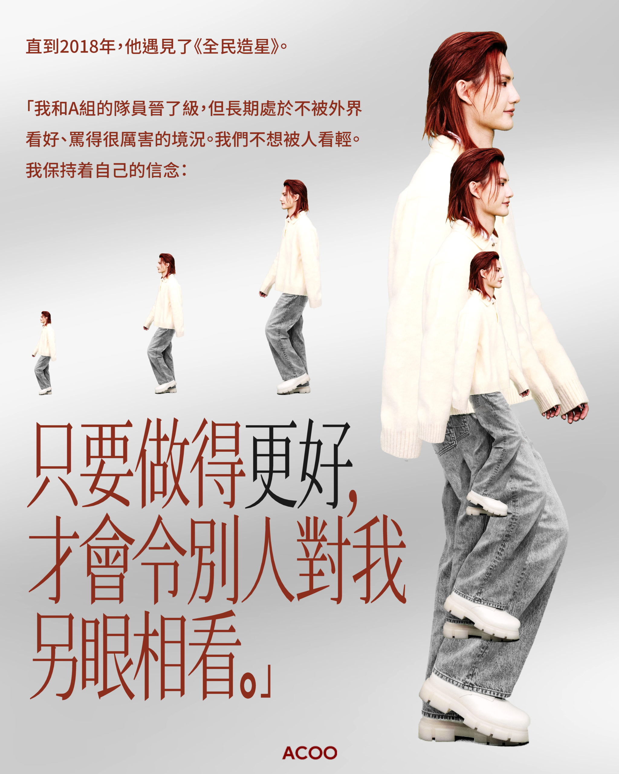 「以前我真的『唔識死』,不知道哪來的自信,根本沒有認真上課過,膽粗粗就去不同地方參加audition。甚麼都不懂,就以為自己會選得上。到我真正意識到自己的不足時,已經18歲了。」在參與了大大小小差不多20次選秀後,他心想,似乎是時候放棄了吧?但好像不太甘心。讀大專時,他突然又遇到一個機會——到內地當練習生,「總覺得,自己好似仍然未想放棄呢。」