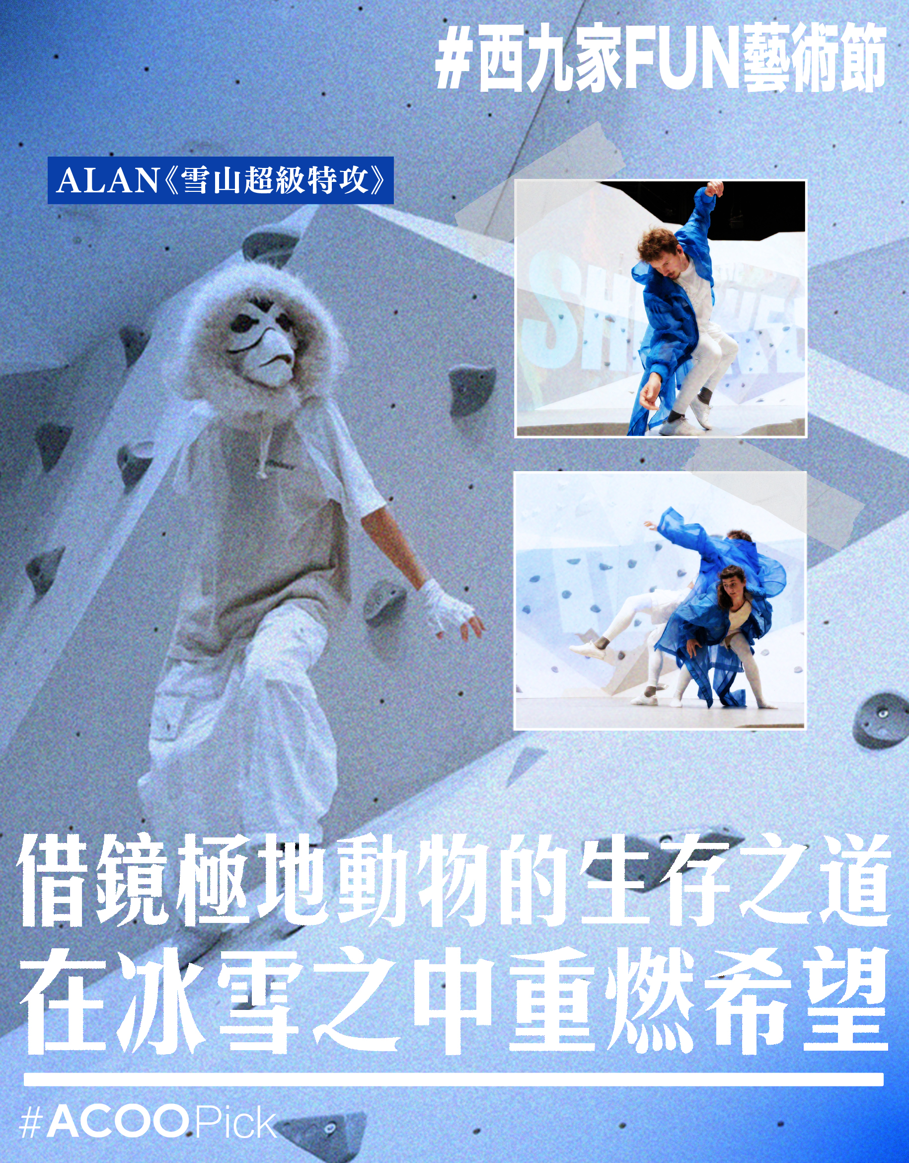 今個週末,西九文化區的自由空間大盒,不再是一般的劇場觀演模式,取而代之的,是一片360度環抱式的冰天秘境! 非牟利創意團隊「Artists who Love Animals and Nature」(ALAN)透過沉浸式故事劇場《雪山超級特攻》,邀請觀眾走入「雪地」席地而坐,跟隨牧羊人和猴子的視角走入雪嶺深處,展開驚險又動人的歷險。 這是一個關於希望、成長和生命韌性的故事。借鏡極地動物的生存之道,其實不需要主角光環,不需要英雄宿命,我們都有自己的超能力。當彼此連結、互相扶持,這份力量更能陪伴我們應對每一場挑戰。 |在西九找到雪山 《雪山超級特攻》的故事從牧羊人和猴子的視角出發。牧羊人的其中一隻羊走失了,而猴子的弟弟也在風雪中與家人失散。徬徨無助之際,他們鼓起勇氣走進危機四伏的雪山陡坡,沿途遇上雪豹、狼群、塔爾羊、兀鷲等動物。這群「雪山王者」擁有超凡能力,例如一流的平衡力量、偽裝與狩獵技巧、敏銳的感官等等,使牠們得以衝破重重險阻,在極端環境中生存下來。 大盒內不設劃位,亦沒有固定的觀賞角度。舞台上高低起伏的結構,配合光雕投影的畫面,整個演出空間頓時蛻變為白茫茫的極地山脈。觀眾入場後,自由坐在「雪地」,彷彿被冰山包圍一樣,以嶄新視角體會人類與動物的共生關係。 |跨地域藝術合作 為了讓這群「雪山王者」活現眼前,聯合藝術總監、導演及聯合編舞林俊浩(Ivanhoe)匯聚了來自世界各地、橫跨不同領域的頂尖藝術家。 參演藝術家包括:形體藝術家 Hikaru Kawasaki(日本)、抱石及舞者 Janosch Horn(德國)、舞者 Yuval Finkelshtein(以色列/西班牙)、活躍幕前的藝人/舞獅運動員楊雅文(THAIMAY)及郭氏功夫金龍醒獅團的師兄們、跑酷 (parkour) 好手劉卓延和葉星樂、形體演員陸錦輝以及霹靂舞小演員 。他們將盡顯所長,以雜技、現代舞、武術、偶戲等元素飾演各種極地動物,讓我們感受生命之間的連結與溫暖。 |極地的生命寓言 冰川崩裂、海平面上升、氣溫驟變,極地總是危機西伏。生活在這裡的動物,每日都以血肉之軀,經歷各種生死博弈。然而在絕境之中,更能激發動物的各種潛能。項目總監及聯合藝術總監林敏兒(Anita)說:「我們想探討的不僅是動物如何在嚴寒和危機四伏的環境中生存,更希望借鏡極地動物,提醒觀眾擁抱自己的『超能力』,應對不同挑戰。」 ALAN 自成立以來,一直以創作為媒介,持續關注動物與自然所面對的生存威脅。《雪山超級特攻》是團隊旗下「吾係動物園」(Happy Zoo)系列的第四章。由2023年起,ALAN 團隊已透過《海洋美術館》的水底世界、《蘇門答臘美術館》的熱帶雨林,以及《人野共樂園》的野生叢林道出動物故事。來到《雪山超級特攻》,團隊剛剛在復活節期間舉辦數碼藝術展覽,結合互動裝置、混合實境(MR)等技術,為觀眾帶來身臨其境的藝術體驗。 今個週末,走進這片冰天雪地,在表演者的引導下,與一眾「雪山特攻」共同參與這場生命寓言。 西九家FUN藝術節2026 沉浸式故事劇場《雪山超級特攻》 📅 日期及時間: 2026年4月10日(五)8:30pm* 2026年4月11日(六)2:00pm / 5:00pm / 8:30pm* 2026年4月12日(日)2:00pm / 5:00pm / 8:30pm *設演後藝人談 📍 地點: 西九文化區自由空間大盒 💰 票價: 標準門票:$380 優惠門票:$190(全日制學生、60歲或以上高齡人士、殘疾人士及其陪同者及綜援受惠人士) 🎟 購票: Cityline 及戲曲中心票務處 *英語旁白,附中文字幕 圖片由製作團隊提供,12位表演者首次踏上大盒裡的雪山場景進行綵排及調整,期待為大小觀眾上演一場又緊張又溫馨的演出。(攝影:Carmen So) 文字:Godric @_godricleung 設計:Ruby @kcmmman ——————— In ACOO, you can discover a dynamic
