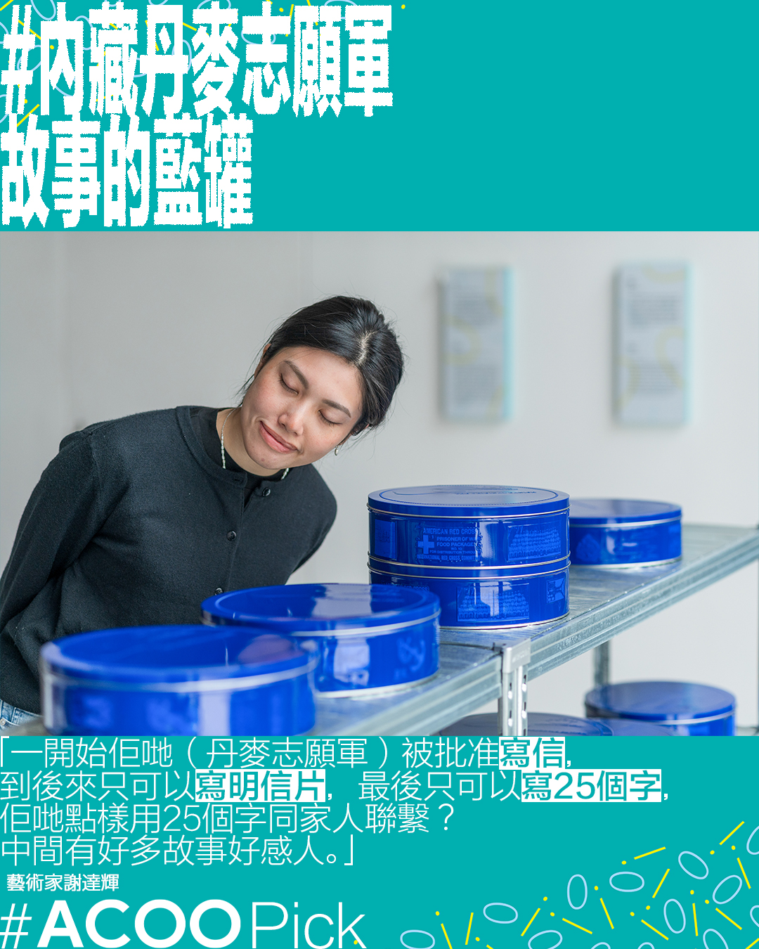 沿着雪糕桶擺放的方向走,到達落地玻璃窗前,這裏放置了十幾個圓形藍罐。靠近這些罐細聽,會聽到微弱的中英文錄音。藝術家謝達輝的這個作品《藍罐紀錄》從弗羅德 · 奧爾森(Frode Olsen)的書取材,書本描述二戰時期,有12名丹麥志願者從歐洲來到香港,參與香港保衛戰,並曾經被囚禁於現址英皇道遊樂場的北角戰俘營。謝達輝透過現場錄音和檔案採訪,放入標誌性的「丹麥藍罐」內,搭配移印照片,展示這段被遺忘的故事:「可能香港人對於丹麥印象都係藍罐曲奇,但其實藍罐曲奇喺丹麥係無人知道。而呢12個士兵,打仗輸咗後,被囚禁喺北角。我想藉呢個機會,做一個research,希望可以搵到唔同人,看看他們對於呢段故事有乜嘢反應。」