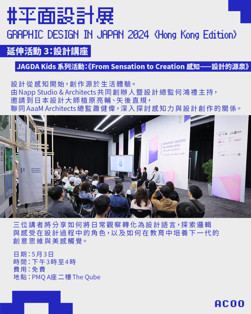 展覽期間特別策劃多場導賞團、設計講座及親子工作坊,邀請本地與日本設計大師親身帶領觀眾探索設計世界。