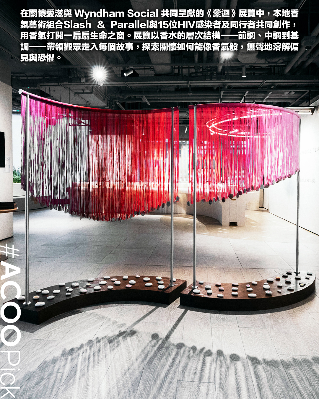 在關懷愛滋 @aids_concern 與 Wyndham Social @wyndham_social 共同呈獻的《縈迴》展覽中,本地香氛藝術組合Slash & Parallel @slash.and.parallel 與15位HIV感染者及同行者共同創作,用香氣打開一扇扇生命之窗。展覽以香水的層次結構——前調、中調到基調——帶領觀眾走入每個故事,探索關懷如何能像香氣般,無聲地溶解偏見與恐懼。