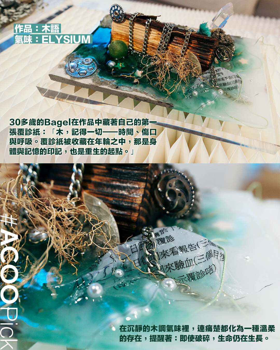 30多歲的Bagel在作品中藏著自己的第一張覆診紙:「木,記得一切——時間、傷口與呼吸。覆診紙被收藏在年輪之中,那是身體與記憶的印記,也是重生的起點。」在沉靜的氣味裡,連痛楚都化為一種溫柔的存在,提醒著:即使破碎,生命仍在生長。