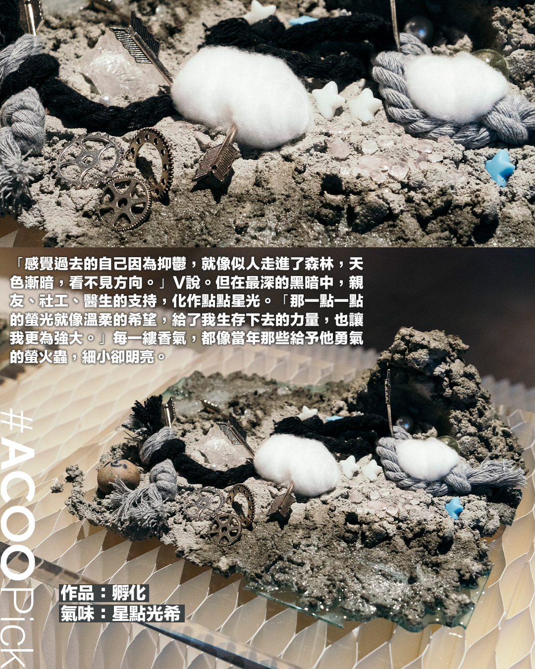 「感覺過去的自己因為抑鬱,就像似人走進了森林,天色漸暗,看不見方向。」V說。但在最深的黑暗中,親友、社工、醫生的支持,化作點點星光。「那一點一點的螢光就像溫柔的希望,給了我生存下去的力量,也讓我更為強大。」每一縷香氣,都像當年那些給予他勇氣的螢火蟲,細小卻明亮。