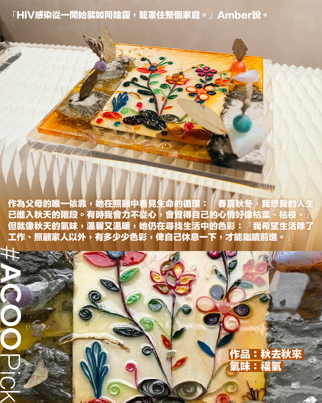 「HIV感染從一開始就如同陰霾,籠罩住整個家庭。」Amber說。作為感染者女兒、父母的唯一依靠,她在照顧中看見生命的循環:「春夏秋冬,我想我的人生已進入秋天的階段。有時我會力不從心,會覺得自己的心情好像枯葉、枯枝。」但就像秋天的氣味,溫馨又溫暖,她仍在尋找生活中的色彩:「我希望生活除了工作、照顧家人以外,有多少少色彩,俾自己休息一下,才能繼續前進。」