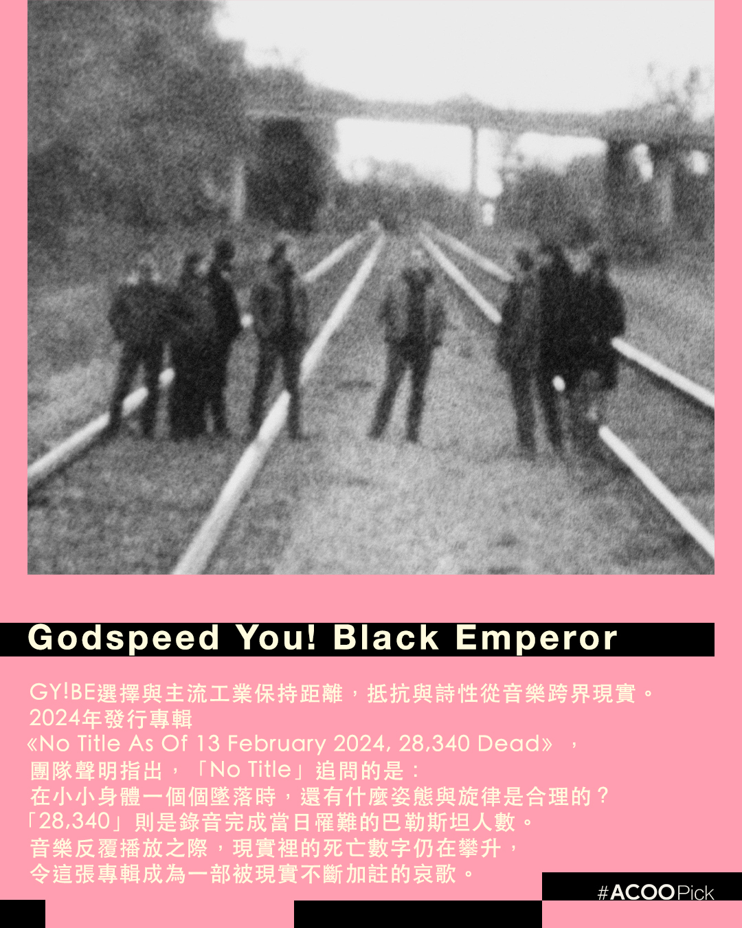 GY!BE選擇與主流工業保持距離,抵抗與詩性從音樂跨界現實。2024年發行專輯《No Title As Of 13 February 2024, 28,340 Dead》,團隊聲明指出,「No Title」追問的是:在小小身體一個個墜落時,還有什麼姿態與旋律是合理的?「28,340」則是錄音完成當日罹難的巴勒斯坦人數。音樂反覆播放之際,現實裡的死亡數字仍在攀升,令這張專輯成為一部被現實不斷加註的哀歌。