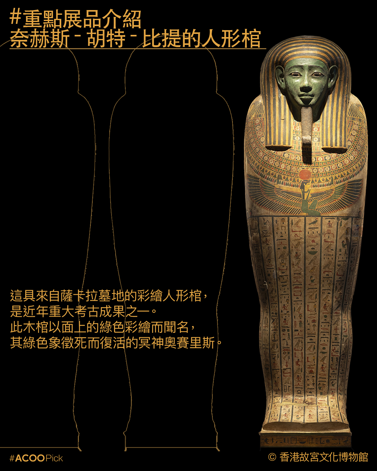 這具來自薩卡拉墓地的彩繪人形棺,是近年重大考古成果之一。此木棺以面上的綠色彩繪而聞名,其綠色象徵死而復活的冥神奧賽里斯。此木棺以面上的綠色彩繪而聞名,其綠色象徵死而復活的冥神奧賽里斯。