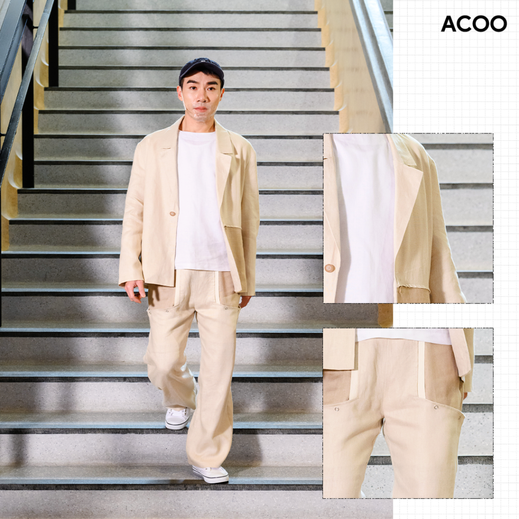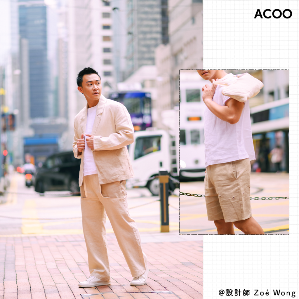 第一套入圍作品由來自非洲毛里裘斯的17歲高中生設計師Zoé Wong設計,由米色、淺啡色的西裝外套配搭純色白T恤和球鞋,感覺乾淨舒適、斯文。Zoé Wong特別選用天然棉麻,因為透氣質地十分適合天氣悶熱的香港,希望能減低夏天走在路上的不適感。另外,西裝外套和長褲也有設計小巧思,它們都能透過摺疊變成環保袋,足以應付突發購物沒有帶備環保袋的需要,時刻保持「暖男」形象。