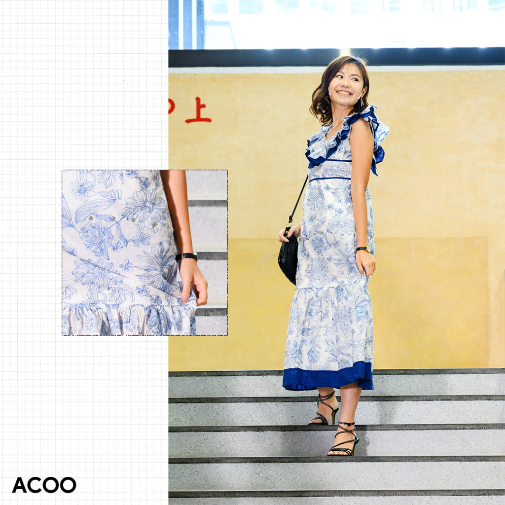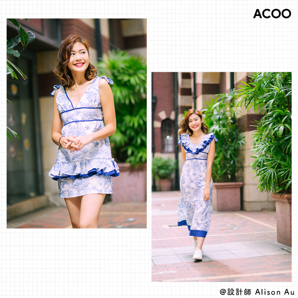 得獎作品由畢業自香港理工大學設計及紡織系的區麗珍(Alison Au)設計,她以田園風發想,特別選用了車花棉布配上藏藍色棉布,加上帶機棉布來縫製裏布,以支持環保。此外,Alison的作品也有很多小巧思,像下擺的荷葉邊能拆出變成圍巾披肩或胸前裝飾,在冷氣房間內提供額外的溫暖。
