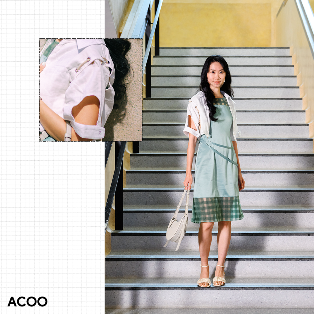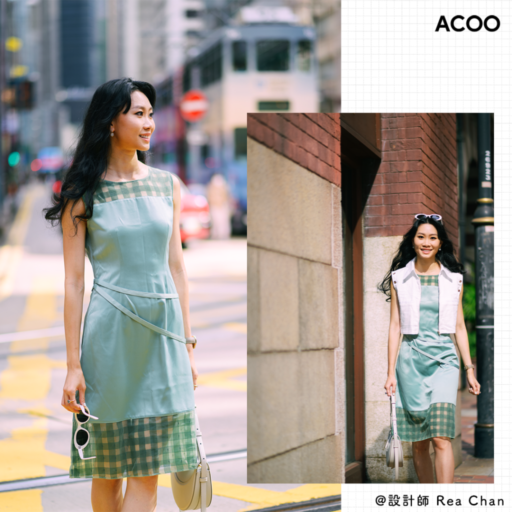 第四套入圍作品同是出於Rea Chan之手,她認為時尚產業一直在污染環境,卻也不是無可避免,如多加使用竹纖維等可持續布料。這個設計正正使用了竹纖維作緞面,質料透氣、柔軟,配搭一種由棉花或羊毛製成的薄紗作裝飾,物料的低敏性亦能減低刺激性而引起的濕疹發作,裙子同時亦使用了天然未染色和未漂白的棉纖維,比一般棉料更吸水,亦大大減輕走在炎下的負擔感。另外,Rea Chan設計了一件泡泡袖的短版外套,袖子除了可拆卸外,還特別設計了一個窗口狀的弧形,在不失美感之下亦能降溫。