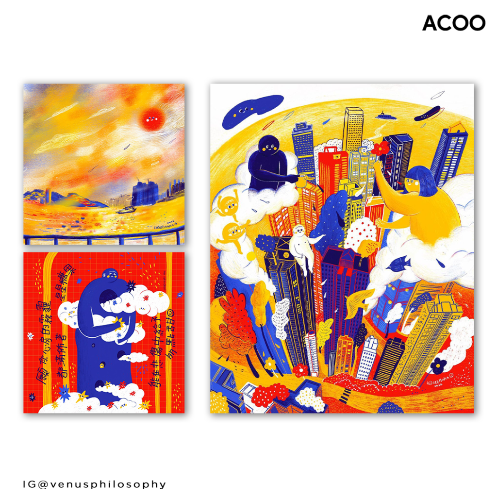 「唔係咁呀!你都唔明我!」溝通是一件極其麻煩的事,好好的表達清楚想法已經是一門高深學問。然而,理解別人也不是想像中簡單,「將心比心」四個大字只能盡力而為,試問沒有真實經歷過,又如何感受別人的感受呢?本地插畫家水水以《你永遠無法知道我在想甚麼》為主題,創作了一系列6件作品,包括5張畫作及1個石塑黏土裝置,每一件作品也有一個無法溝通的故事。 若果你也徘徊在溝通困難之中,感到社交疲勞,想找一個地方靜下來歇息一下,那不妨去Whatever. Coffee看一看這個畫展,從中尋找一點理解和安慰。 《你永遠無法知道我在想甚麼》是水水第一幅創作的畫,躺在小水池中的是她自己,坐在池邊的是她朋友,而池中的水則是家中出現的變故。整個人沉浸在事件中的水水非常難受,朋友嘗試努力安慰,卻無從入手,身處的位置不同讓關心的話與水水表達的內容完全無法重疊。 「其實可以嘗試躺下去,或讓身體更多部分浸進池中,拉近彼此的世界。」水水說,或許對於身在其中的她,其他人的盡力諒解比虛無縹緲的安慰更重要吧。 《I can't hear you》說的是人們總在努力表達自己,把聲音放大、長篇大論的說個不停,卻沒有想到對方把話聽進心裏,水水舉例:「有些人喜歡寫萬言訊息,但收到的人可能覺得很沉重,不想看。」就如畫中一樣,一方拿着大聲公想要把自己的話清楚告訴另一方,卻沒有留意到大聲公的嘈吵音質,也沒有留意到自己的位置站得太前,直接把大聲公堵在另一方的肚子,片言隻字也無法聽到。 偶爾我們總想一個人躲起來,好好的享受獨處的時光,在《Isolation》這幅畫中,每一間小屋也是一個人的小天地,視乎自己的狀態可能是沒有窗、關上門、偷看着外面的世界等。不過,身在資訊如此發達的年代,實在難以完全斷掉與別人的聯繫,最低限度也會傳傳訊息,這就是地上的路,正在看畫的你又是哪一種狀態呢?有趣的是,若你是親身前往看畫,會發現畫作被封在框框之中,那是因為你也是躲在自己的小屋偷看外面的世界。 《Inside》是整個系列的作品中,水水投放了最多感情創作,也是她最喜歡的一張畫。畫中的她把自己收在一副骸骨之中,她解釋:「那是男人的的肋骨。」水水爸爸的辭世並沒有留下遺書給她,讓她完全無法釋懷,也想不通父親此舉的原因,但生死相隔已成事實,她說:「即使我鑽入骨,也無法聽到他的話。」這是無法再溝通的痛。 水水在創作的《對峙》有兩個版本,分別是影片及光柵版畫,原因是她想更動感的表現人們在爭吵時的自我意識膨脹,水水解釋:「靈感來源是我和我媽,她有自己的價值觀、主張,不會聽我的話。」所以,在不同角度看畫作時,便可以看到雙方來勢洶洶的向對方衝襲,希望把自己的想法強硬的套在對方身上。大多時候,雙方各持己見時,其實也不見得非得要得到一個共識,互相尊重也很重要。 最後一件作品《以為》是黏土雕塑,兩隻「水水」一隻藍色,另一隻黃色,看起來大致上是相同的。水水說:「藍色那隻是我的本體,拿起來是比較重的,而且它的背後有一印記,黃色是沒有的。」我們常常「以為」自己是一個模樣,卻總會看漏了一些自己的特質或缺點。 可能我們常以為的溝通問題常來自於別人,但其實很多人也忘記要好好與自己對話,了解自己的需要和想法,才能真正的放鬆和治癒心靈。 插畫家水水從小已很喜歡創作,雖然曾經有一段時間因為情緒問題已無法提起畫筆,不過正因為如此,也為她留下一粒種子,在日後創作「動力神社」及投射自己的角色「水水」,她指:「水水的身型會隨着自己的心情狀態有變化,傷心時它會扁瘦一點,開心的話則會胖胖的。」最初,有創作這個品牌和角色是有一個故事的:水水在外太空時,因為衣服失去動力,所以只能飄浮於宇宙,它突然看到一座神社,連接後便得到動力,最後更成功降落在一個星球,她相信:「動力可以無中生有,現在沒有動力不要緊,休息過後的某一刻可能便會找到讓你充滿動力的事物,重新出發。」 文:Hoiyan|攝:Vincent Wong 《你永遠無法知道我在想甚麼》 日期:即日至3月31日 時間:上午11時至傍晚6時(逢星期一休息) 地點:Whatever. Coffee(深水埗大南街172號B地舖)