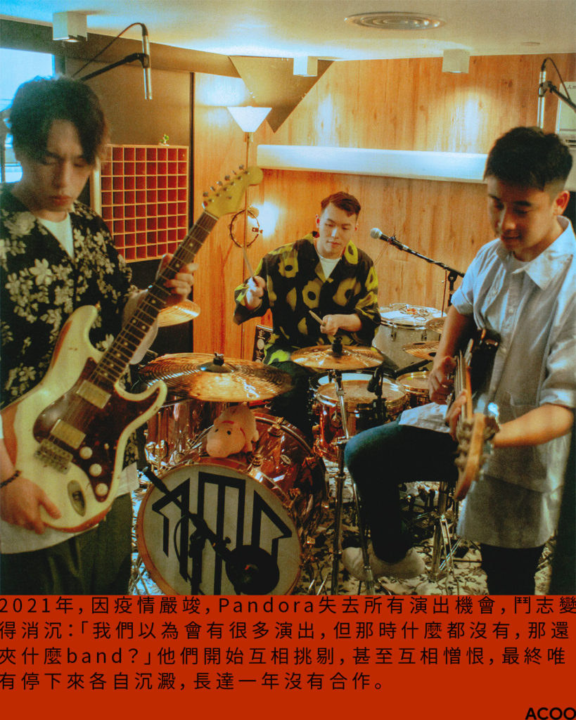 一人不想要某隻歌,另外兩個卻很想要,那到底是做還是不做?「以往我們都會選擇照做,不太敢表達,或者沒想太多,先照著去。」但互相屈就下,即使最後把歌做出來了,也不是各人都滿意的作品。他們為此不斷吵架。而最嚴重的一次爭執,發生在2021年。當時因疫情嚴竣,Pandora失去所有演出機會,鬥志變得消沉。「我們以為會有很多演出,但那時什麼都沒有,那還組什麼樂隊?」他們開始不斷互相挑剔,甚至互相憎恨。