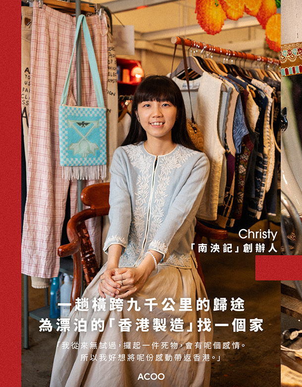 一切源於2017、18年的一場異鄉的相遇。 那年Christy剛到英國求學,人生路不熟,屢屢碰壁,偶爾一次踏進二手衣物店,一件標籤寫著「Made in Hong Kong」的襯衫赫然在目。那刻她心頭一震,一種難以言喻的激動油然而生:「我從來無試過,攞起一件死物,會有呢個感情。所以我好想將呢份感動帶返香港。」 這件襯衫,在數十年前或許跨越9000多公里從香港被帶到英國,最後竟然又橫跨大半個地球,跟Christy回到它出生之地。學成回港後,Christy開了古著店「南泱記」,繼續在世界各地尋覓、記錄「香港製造」衣物,又著手研究香港製衣業歷史。從一塊布料到一間小店,一步一步拼湊那段香港的舊畫面。 文字:Heidi @heidi.is.strong 攝影:Andrew @andrew_bangchan 設計:Owen @wai.ho.98 |與「香港製造」初相遇 拐進位於火炭的工業大廈,乘電梯抵達「南泱記」,溫暖的黃色燈光映照著衣架,整齊排列起一件件古著。細看衣服領口的牌子,發現為人熟悉的GAP、FILA、Patagonia等牌子,原來都曾在香港設廠,讓人嘖嘖稱奇。 1997年生的Christy,大學念的是時裝設計。在就學時期,已常與衣服為伴,又喜歡到美之等不同的二手衣服店尋覓靈感。到英國求學後,思鄉的感覺加上課業的壓力讓她喘不過氣。有次外出散心,在一間二手店發現了一件燈芯絨襯衫,標籤竟然寫著「Made in Hong Kong」。那一剎那,她竟然有點鼻酸:「自己讀書以嚟,一直覺得『香港製造』嘅嘢係好耐好耐之前嘅事情,甚至可能已經唔存在。嗰一下,覺得好神奇。」 雖然那件衫殘殘舊舊的,但Christy還是決定把它買走,及後又陸陸續續再到不同店舖尋找「香港製造」衣物。學成回港後,她想:「會唔會真係有機會,我可以將呢啲衣服全部帶返香港?我好記得自己搵到第一件『香港製造』嘅感情,所以我好想將呢份感動帶返香港。」2022年,「南泱記」正式開業。「南」字代表香港;「泱」取自Christy中文名字「映」的其中一部分,加上「水」,便合成了「南泱」。 |「香港製造」背後 8年裏,Christy收集了約800件香港製作衣服,帶它們回港,再為他們尋覓珍惜它們的主人。時裝設計背景的她,特別對刺繡類,或剪裁特別的衣裳情有獨鍾。「我好鍾意佢哋點收口,睇啲拉鍊、鈕扣。雖然佢哋都係成衣,但剪裁咁特別,我會諗,究竟佢哋點樣控制成本?」在這段買賣的過程中,Christy也對「香港製造」四個字有了理解:「香港製造嘅特色,我諗咗好耐,最後答案應該係『快靚正』。」 「我自己覺得香港製造嘅衫係好靚,不過老一輩會覺得香港製作好『yarp(劣質)』,唔似法國、歐洲品牌刺繡咁精緻。但香港製造嘅衫可以喺最短時間之內,用最平嘅價錢做到最好嘅效果。而且香港女工好有創意,佢會用盡所有方法解決問題。」Christy隨手拿起了一間白色針織衫,驟眼一看,襯衫上以不同顏色的小珠,勾織成盛開鮮花的圖案,但仔細一看,才發現小珠根本全部都是半透明,顏色不同的,原來是珠子下面的棉線。「咁樣做可以增加立體感,同時又唔會好高成本,體現到香港人嘅『走精面』。」 Christy在「入貨」時,偏向選擇看上去較年輕,一般後生仔都能穿的款式,不過她後來發現,南泱記的顧客群比Christy想像中的更要闊,「甚至試過有婆婆同家人過嚟睇,原來婆婆以前有份做呢啲衫。佢無諗過香港仲可以搵到、見到咁多以前佢做過、見過嘅款式,勾起佢好多回憶。聽到呢啲故事,我都好開心。」 |舊事物的歷史課 透過這間小店,她希望亦能勾起客人們的好奇,從而更了解今時今日的香港製造。 經營「南泱記」的這段時間,Christy形容自己最大的改變是,開始不能自拔地看書、上網查找、尋覓有關香港製造業的歷史。「不論製衣定係製造業,各行各業嘅過去我都好好奇。最後我發現,以前香港做嘅嘢真係好多好多,短短二三十年孕育咗好多事情。我覺得係好神奇嘅一件事,點解會咁少人知,或者咁少人提呢?」 |不完美的完美 Christy逐漸對香港製造多了認識,發現香港以前不少製衣廠的客人都是美國品牌,例如「Christopher and Banks」、「Susan Bristol」等。不少美國家庭都會把二手衣物拿上拍賣網放售,這也成了Christy入貨的途徑。 她解釋,香港製造的舊衣物不難找,不過每次都需要花不少時間挑選。「畢竟大多都已經被保存了4、50年,呢啲衫,尤其刺繡、穿珠類,好容易甩線。而羊毛衫,對於某啲蟲嚟講又『好好味』。香港5、60年代又多做呢類型嘅衫,所以係最難保存。」 起初,Christy每次收衫後,都很擔心衣服有破損,特別是羊毛衫很容易穿窿,她也會小心翼翼地修補。「以前啱啱開業嘅時候,我會好擔心,死啦穿咗個窿,或者布料好大撻污跡,客人會唔會好介意?但有一次有個客人揀中一件未修補好嘅背心,畀錢嘅時候我話,唔好意思,膊頭位其實穿咗個窿。但佢話,唔緊要呀,舊衫係咁㗎啦!」這就如當頭棒喝一樣,Christy發現,對呀,這是舊衣服必然會發生的事情。「其實好多人唔會介意件衫爛咗,反而會視為穿著嘅痕跡。」也許這也是古著的意義。 ——————— In ACOO, you can see #ACOOPerson.