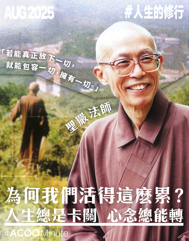 在紛擾的世界,愈來愈多人好奇佛法的哲理,藉此尋求內心的平靜。不少人開始接觸佛法或禪修,都是透過聖嚴法師的著作或法鼓山的活動。法鼓山創辦人聖嚴法師擅長把傳統禪宗的智慧,以平實的語言解釋,亦強調在日常生活中禪修,拉近佛學與人的距離。他說,禪的最高境界緣於「放下」,圓寂前留下四句遺偈:「無事忙中老,空裏有哭笑,本來沒有我,生死皆可拋」,可說是畢生修行的總結。他從挫折困頓的一生中學會放下,亦花了一生教人放下,獲得自在。 聖嚴法師生於戰亂時代,13歲時父母因局勢動蕩與貧困,將他送到寺廟出家。1949年他因逃避戰亂,還俗入伍,隨軍隊去到台灣,十年後再度出家。動蕩時代,人的顛沛流離、生命的無常,聖嚴法師都經歷過。眼見人們遭受苦難,他希望將佛法傳給更多人,教人減少痛苦。但當時漢傳佛教衰微,不被重視,信仰變成寺院辦法會賺錢的法門,於是他發表了許多文章,希望佛教能有所改革。為了佛教的革新,他去到日本留學,吸收學習當地佛學教育的經驗,並取得文學博士學位;又遠赴美國,設立道場指導禪修,將漢傳禪宗介紹給西方社會。他在60歲時創建法鼓山,如今在全球多個地方都設有道場,他亦成為國際知名的禪師。 復興佛教的道路不易,聖嚴法師曾說,一生都是從挫折、困頓之中走過來的。他在日本留學的過程非常艱苦,有時只吃一餐,靠替人誦經和做導遊勉強維持生計;初到美國的頭幾年,其時年近50的他居無定所,吃不飽飯,更挫折的是沒能做想做的事,後來要靠弟子協助,才租得起一個破舊小公寓作為道場。面對困境,他以「境不轉心轉」的心態面對:「我經常有這樣的信心,山不轉路轉,路不轉人轉!如果人也動彈不得,也還可以心轉啊!」即使環境無法控制,但人亦可控制自己的心,就能自由。 聖嚴法師提出「四個它」面對煩惱:「面對它、接受它、處理它、放下它。」他說,任何事物的發生都有其原因,不須追究,唯有面對它才是最要緊的;勇敢接受得與失,盡心盡力去處理,但處理後就要學會放下,不再憂慮。「每一個人都要懂得放自己一馬,也要放別人一馬,不要把生命浪費在鑽牛角尖上。」從小我們都在學習抓緊甚麼,原來放下,才是一生的修習。 文字:林三 @lam.three 設計:Po @p12_o28 -------------------- In ACOO, you can get refreshed in #ACOOMinute.