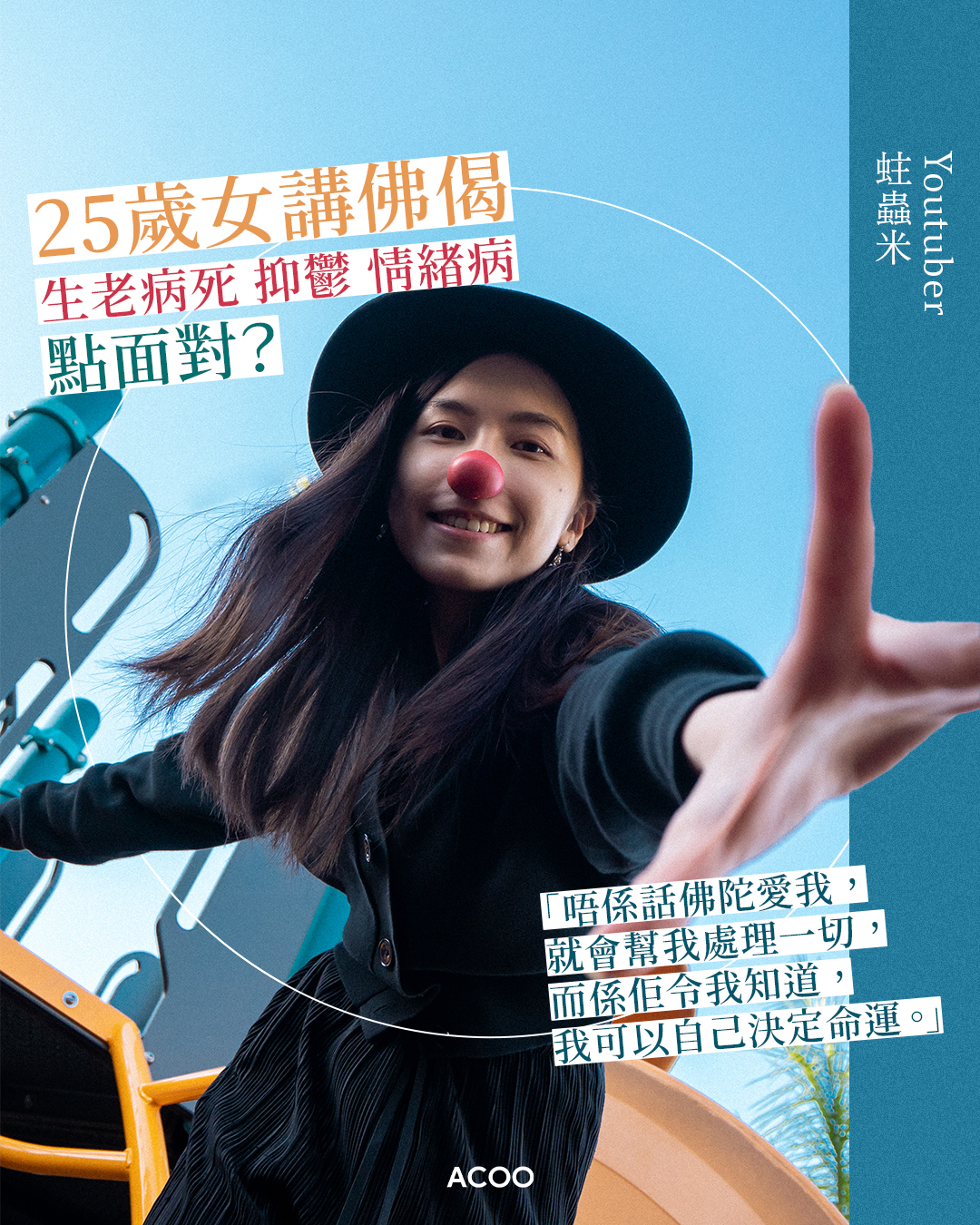 【Hello, strangers, this’s mi.】 若然說Youtube世界是一個五味雜陳的滿漢全席,那麼「蛀蟲米」應該是一味看上去平平無奇,吃起來卻暖入心脾的一鍋粥——你未必會吃上癮,但當你生病的時候,你總會想來上一碗。 這個25歲女生,每周都會頂着一個紅色小丑鼻子,在客廳淡黃色窗簾前的一隅拍片講佛。人生軌跡與佛相交,或是源於米年少時的苦難:她在中學時期喪母,其後開始苦苦追尋人生意義。在大學讀哲學但仍找不到答案的時候,佛學像一個慈祥的老爺爺現身在米眼前:「喺哲學好似畀屎我食嘅時候,佛係呵返我——唔係話佛陀愛我,就會幫我處理一切,而係佢令我知道,我可以自己決定命運」。 文字:Heidi @heidi.is.strong 攝影:Hiuyan @hyphotgrap 設計:@wai.ho.98 |為何生存? 「我覺得自己要受嘅苦好似喺青少年階段已經受曬」,米這樣說,因為她的母親在她15歲時因癌症離去,這對於一個小女生而言,無疑是一個「毀滅性的打擊」。她很想知道自己為何要誕生於世上,「點解我會喺度、點解我要生於呢個家、生於香港?」,但一直都找不到一個讓自己順服的答案。 於是,她大學時讀文學院,主修哲學,但西方哲學只讓她感到「更棘」,「西哲嘅知識論同形而上學,好似純粹喺一個文字遊戲,例如,Mary喺一間房入面認識所有紅色嘅知識,但佢出去房間,先第一次真正見到紅色。咁佢係咪再學會啲新嘅嘢?感受係咪一種知識?後來我就發現心靈越來越棘,或者會令我質疑,我嘅痛感係咪真實嘅?」大學Year 2時,米為了「靚grade」選修了佛學課程,「法師一入嚟就笑笑口,我好期待自己會駁斥到佢嘅嘢。但佢第一堂竟然係講科學,講佛無所謂一個造物主,又提出打坐對腦電波影響嘅實證。我即刻O咗嘴!」。 這位法師,把米心入面的疑惑破解,讓她感到莫名興奮。於米而言,佛並非讓她人生變得美滿,而是讓她學會「喺一個充滿屎嘅空間應該點自處」。於是,她決定副修佛學,畢業後更繼續攻讀佛學碩士。「佛」讓她了解自己,接受「無常」。 |全民造星? 米從小喜歡表演、喜歡唱歌演習,曾學習形體訓練兩年,「我屋企本身唔係好認同表達情緒呢件事,形體幫我釋放內心」。 2021年,全民造星4公開選秀,開放即場walk-in報名。米好想為自己做一件事,讓自己不會後悔的一件事,於是那天她早上6時便到,成為了全場第一個參賽者,「當時我覺得自己好型!」然而一如所料,她落選了,而且評判更是毫不留情的批評她,「當刻我太驚訝,好似隻meme倉鼠一樣呆咗。完成成件事,我踎喺廠外。夜晚不斷回想當時嘅情景,不斷自我攻擊」。最後,她在節目中出現了僅僅3秒。 沉澱後,米告訴自己,評判只是為了節目效果而對她「好harsh」,不過同時她亦自我拷問:自己的路應該怎樣走下去?她想到了近年社會氣氛低迷,「唔知點解有個想法,好想做一件事,等大家可以開心啲自在啲」。她先是下載了一個匿名交友通話app,打算開解陌生人的心,「但每次都畀人cut線,可能佢哋預咗係要講鹹濕嘢」。 |癲喪地講佛 與此同時,米發現身邊越來越多朋友知道她鑽研佛學後,向她查問有關佛法的事,「佢哋話,我好似發咗光咁,想了解我嘅改變」。她遂想,會否可以開一個Youtube Channel講佛?朋友聽完她的意念,講了一句:「我覺得香港人就係需要呢啲嘢」。米聽罷,即日去了深水埗,買了一套最基本的拍攝器材,當晚「好似野人一樣,無修眉、無剃鬚」就拍了第一條片。她穿了全黑的衣裳,配以一個小丑鼻子,又用了誇張的肢體語言表達,「好dramatic,想做到一個小丑效果,引人笑」。 一開始,米的頻道觀看少得可憐,「得20個views,其中仲有7、8個係我自己click入去睇comment」。後來,她扭盡六壬想為內容增添趣味,例如改編了COLLAR的《Call My Name》,一句「BU BU BU BU BU BUDDHA!」在社群引起熱議。她說,自己慢慢被注意的原因,是自己堅持以理論配以日常生活實例解說佛法,這正是她與其他「講道者」的分別:「即係一個長輩灌輸知識畀你,大家天生就會抗拒,但我成日都話,你見到一條女,癲癲喪喪咁講啲好Make sense嘅嘢,就會令人好想睇落去。」   |創造因緣 現在,米的頻道已累積逾6萬訂閱,每星期會更新一次;instagram會發布一些輕文字「講經」開解大家,亦有接近2.5萬followers。不少粉絲會向米「求救」,「我試過一日收到50幾個人DM,頭一句都係,我爸爸大病就快死了、我老公有抑鬱,自己都有情緒病,點算好?⋯⋯當有人求助,我無可能唔理。」 米眼見近年身邊多了年輕的佛弟子,認為香港人近年的確有「向內尋找平安」趨勢:「氣氛越來越低,就會衍生兩個極端,一批人係絕望,覺得所有嘢隨便啦,於是向外尋找快樂,呢種係唔健康嘅快樂;另一批人會意識到,唔向內尋會崩潰,所以追求身心靈嘅滿足,想搵一個出口,想了解自己同宇宙多啲。」她認為,佛法開始被意識到是「一套好正嘅生活哲學」,「佛教唔係一樣會主動令人快樂嘅嘢,唔係神奇藥丸。學佛可以更真實地睇到呢個世間嘅一啲邏輯,睇到每一個人背後嘅苦,又睇到自己嘅一啲不足。只要我哋願意去學、去修,就會發現有好多本來令我哋好唔開心嘅嘢,好似都冇乜嘢,咁已經可以減少到好多煩惱」。 近年的社會事件,以至持續3年多的疫情,都令香港人變得無比壓抑:「呢個說法好似好離地,但無常就係講,我哋每個人每一刻都係變緊;執著嘅意思係,我哋太過覺得一件事一定要係咁嘅模樣。覺得自己『原本可以點點點』。但緣起法就係