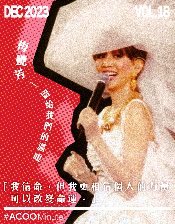 每年總有幾天,覺得是需要紀念的日子。其中一個是12月30日,一代天后梅艷芳殞落的那天。二十年過去,樂迷對她的思念仍未減退,足見其影響力之深。 在告別演唱會上,穿著婚紗的梅艷芳唱畢最後一首《夕陽之歌》,瀟灑揮手道別歌迷,也道別40年短暫但璀璨的人生,為戲劇般的一生劃上句號,這一幕深深烙印在香港人心中。 It’s better burn out than to fade away,可說是梅艷芳一生的寫照。病逝前45天,她在紅館開了八場演唱會,當時她的身體已相當虛弱。與梅艷芳情同兄妹的造型師劉培基曾憶述,表演前梅艷芳身上貼滿止痛藥膏,演出期間亦有發燒,一直發冷,全身乏力,要倚靠在助手身上,直至升降台準備上升前一刻。但她仍然堅持演出,以頑強的意志力完成演唱會,在台上拼力燃燒生命最後的火光。 梅艷芳將畢生傾注舞台,但她小時候的理想,其實是當律師或警察,維持正義。她說,小時候沒讀太多書,知道自己唯一的路就是唱歌,無法選擇,那她只有把這條路做到最好。「我信命,但我更相信個人的力量可以改變命運」,這種信念,令她由小小的舞廳,走上香港最大的舞台,稱霸樂壇,成為一代傳奇。當你看見她在舞台上的身影,更加感受到她信念之強大。她知命,知道有些事無法選擇,但在可以選擇的範圍內,她倔強固執,對自己的決定偏執地擁護。 瀟灑、豪氣、前衛,都是梅艷芳的形容詞。瀟灑,不僅體現在她的形象和處事手法,也體現在她面對生命的難關。「我是一個不怕死的人,我時常覺得上天派我來這個世界,一定要我做完該做的事,才可以走,如果上天要我走便走吧。」面對生死,她看得灑脫,情願過得盡情,也不願苟延殘喘。林夕曾評價梅艷芳:「她在有限的時間裡發光發熱,告訴我們如何才沒有白活一場。雖然我們不能改變生命的長度,但卻可以改變生命的寬度。」 火花燃盡過後,殘留的溫暖卻延綿至今。The queen is gone, but she is not forgotten. 文字:林三 @lam.three 設計:Kayan @yipyn -------------------- In ACOO, you can get refreshed in #ACOOMinute.