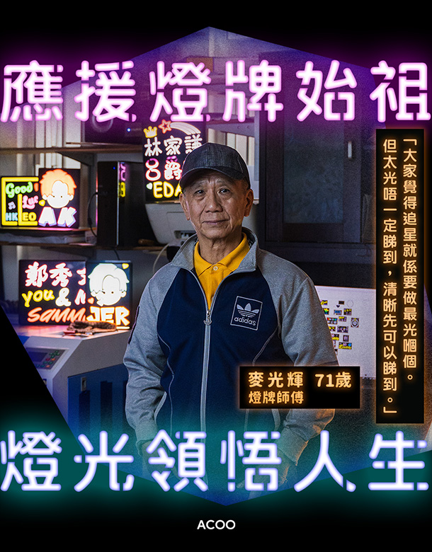 表演場館內,燈光迅速熄滅,音樂轟炸,此時粉絲們馬上跟隨節拍揮舞手上的燈牌,忘我地大聲呼喊。滿場燈牌,彷如點點星光拱照台上。 若說歌手和粉絲的榮耀是一體的,那麼這份榮耀肯定少不了製作燈牌的人。麥光輝今年已經71歲,從上世紀8、90年代開始做燈牌,見證着歌迷們從追劉德華、到F4、飛輪海,再到MIRROR、林家謙⋯⋯當香港歌壇浩浩蕩蕩迎來另一新世紀,已經可以兩蚊搭車和攞生果金的麥光輝亦不甘於停留在舊時。從前大家用LED燈牌,現在他創作出可充電可換圖案的燈箱。他又自學電腦畫圖、laser cut,更是一個超in的網民:「你有無睇過香港做設計慘過食屎協會?畀100蚊又要畫又要改,到頭來成件事值幾多錢?」 麥師傅勞碌近一甲子,戲言自己常「生意失敗」,尚未發達,但也不願就此停下來。若然人生方向有些許迷惘,也許可以聽聽麥師傅的格言:「大家覺得追星就係要做最光嗰個,畀台上面嗰個人清晰見到自己。但(燈牌)太光唔一定睇到,清晰先可以睇到。」追星、做人,本質其實很似——我們未必需要做最光芒四射的人,只要認清自己心之所向,一切都總會被看見。 文字:Heidi @heidi.is.strong 攝影:Hiuyan @hyphotgrap 設計:Owen @wai.ho.98 |半輩子與光為伴 麥師傅80年代從事進出口玩具生意,並在大陸設廠,主要做燈籠、螢光棒等產品。有日,麥浚龍(Juno)的經理人知道他對燈光產品熟悉,特意登門造訪,「佢問我可唔可以整一塊板,整啲字喺上面,叫我試吓。」那時候他並沒有概念要怎樣做,誤打誤撞下,他把「J」字固定在亞加力膠板上,後來幾次再整,又成功多放幾個字上去。 那時候,香港還未有人專門做燈牌,「嗰時香港追星會用燈牌嘅人少之又少,佢哋一小部分人會用鐵絲網整,供電用水電,仲要搵架車推出去,好大陣仗。」後來,麥師傅的燈牌在追星一族中廣泛流傳,「最犀利係啊啤梨,葉文輝!嗰班粉絲好勁,要求我整一個四五呎高嘅燈牌,佢哋又會攞喇叭、查查(鈸)。」 及後,新加坡、馬來西亞、泰國粉絲紛至沓來。「我做唔到(大)量,但我做到有特色。例如泰國班粉絲,佢哋嘅燈牌又有象又有樹,畀人知道佢哋係泰國嚟嘅。」麥師傅執起一支以LED燈串組成的燈棒,原來這個也是他首創的產物,他驕傲道:「當年大陸啲人當我皇帝咁搶我啲貨。」而現在,LED燈泡亦早已普及,「你知唔知一盞呢啲LED燈,一開始賣幾多錢?199幾年,起初大陸有得賣嘅時候,25蚊一粒。依家?一毫子有十幾粒啦。」 |那些被忽略的心思 對着光的這些年,麥師傅深知其實光除了明亮,也會刺眼。他遂研發了「燈箱」,原理和街邊招牌一樣——一個白燈箱,以「尿袋」供電,外頭以鏤空有色膠片描繪圖案。燈箱光線柔和、更輕便之餘,更可以換膠片重用、改圖案。其後,他又想,如何可以把燈箱的用途增加?他又研發了可放入相機機頂位置的小燈箱,讓粉絲「飯拍」的時候吸引偶像的注意,「偶像見到燈箱,就等於望到鏡頭。」 以前做LED燈牌,麥師傅通常無需草圖,直接手造圖像字型再焊接;現在一切都go digital。麥師傅如常坐在電腦前,一個個按照日期及明星分門別類的檔案夾塞滿螢幕。單是一個張敬軒的file內,便已有幾十張訂單,每個都獨一無二,當中有不少讓非粉絲摸不著頭腦的slogan,例如「網癮中年張敬軒」、「七師傅老公」等。再看看MIRROR的檔案,除了人名,麥師傅更會親自畫圖,「最難係大家畀張圖,以為我就一定做到,但其實部機器係計線條,如果啲線唔連,都係要重新再畫一次。」 想要製作燈牌的客人會先WhatsApp麥師傅,麥師傅再按照需求設計畫圖,一塊燈牌三百多元,「畫個公仔都已經畫我一日。」如果麥師傅是年輕設計師,一切可能都是手辦眼見功夫,但對於年屆七旬的他,卻是一步一腳印走來的:「我全部都係自學。我小學都未畢業。我唔識機械,乜都唔識。我1993年買第一部電腦,嗰個人問我,你識唔識英文?我話唔識,佢話咁你唔好買啦,我一定學唔嚟。但我話我一定要買。」有時候那些追星妹妹會叫麥師傅「收貴啲啦」,事實上,他也會因為粉絲無理地不斷要求「改嘢」而感到不忿,看着電話的「奪命追魂message」,麥師傅淡淡然道:「呢個,遲啲先覆。」 |舉牌/做牌的原因 歌手、樂壇都有起有跌,麥師傅的職業生涯亦然。他笑言不懂把生意「發大嚟搞」,角色也很被動,「娛樂圈有週期性,全世界都係。有衰落都有興旺。」不過,一日有粉絲,似乎就會有燈牌的需求:「粉絲要燈牌,係想支持粒星。你如果就咁過去,無特別嘅嘢,你就唔會出位。追星嘅人都係想畀人知咁解。」 粉絲繼續高舉燈牌,是為了讓偶像得知支持者一直存在、一直陪伴。而麥師傅堅持做下去,只為保持年輕:「一個人如果唔做嘢,會變殭屍!」在娛樂圈中,他最欣賞的是79歲的尹光,「你見到佢嘅動作好靈活!你就係要保持呢個心態,佢呢個年紀仲會作曲、諗點樣氹人開心。如果只係諗享受,個腦唔用會生鏽㗎。」 看過這麼多瘋狂粉絲,伴隨着歌迷一起走的麥師傅有無追過星?「我欣賞自己多啲。」一生中未曾飛黃騰達的他,微笑地自信道。 In ACOO, you can see #ACOOPerson. #追星 #燈牌 #MIRROR #張敬軒