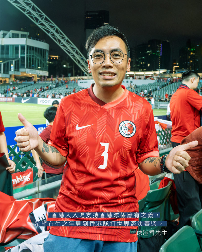 「香港人入場支持香港隊係應有之義,希望有生之年見到香港隊打世界盃決賽週。」入場支持港隊對於球迷香先生是責任,也是義務,更有着心靈上的安慰。