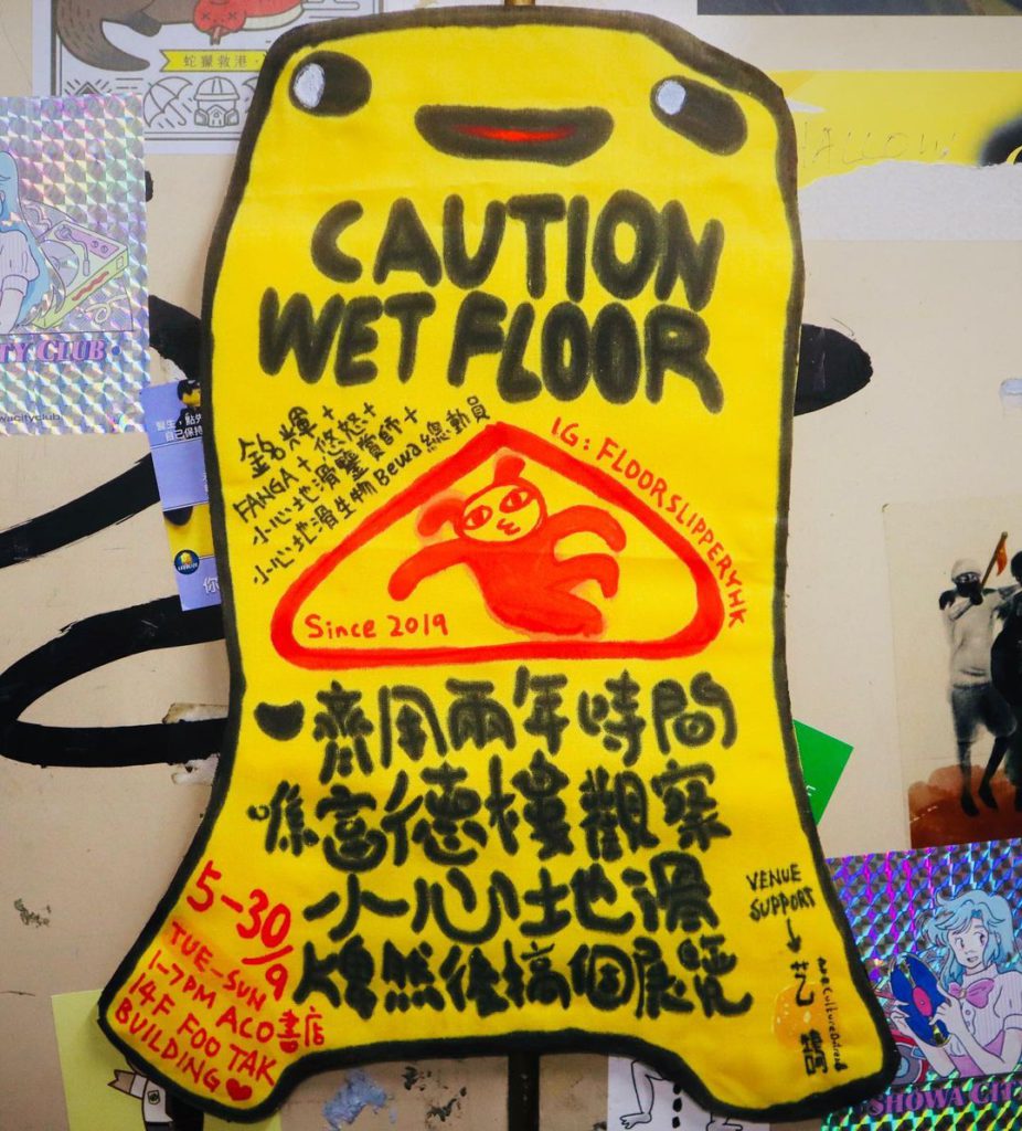 「小心地滑鑒賞師」在社交平台用了數年時間紀錄告示,拍下超過 3000 幅相片,每一幅相也配有自己的獨特故事。例如一個小心地滑告示被放置在乒乓球桌上,被形容成「沒有對手迎戰的下午,他一個人調皮的在桌子上悠晃,寂寞無法打發。」這些寂寞時刻,都被紀錄在灣仔富德樓的艺鵠書店。展覽名稱相當趣怪-【一齊用兩年時間喺富德樓觀察小心地滑牌然後搞個展覽】。