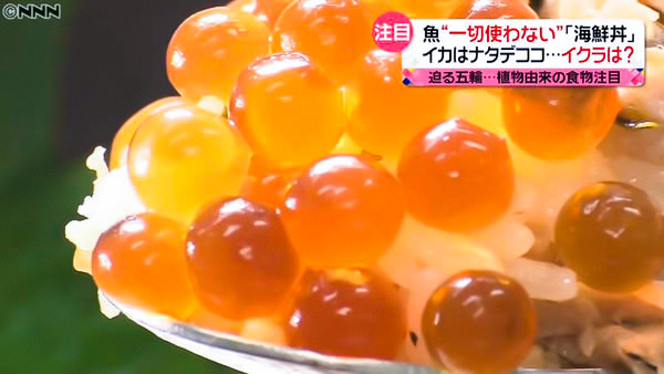 日本東京奧運還有10天就舉行,為了配合各國選手對素食的需求,同時保留日本美食的特色,奧運主辦方推出「素海鮮丼」,「三文魚」、「魷魚」以及「三文魚籽」,賣相跟平常吃開的沒有兩樣,但原來全部是素食 — 三文魚由黃豆製成、魷魚是椰果,而三文魚籽則是昆布萃取物及醬油高湯染色而成。