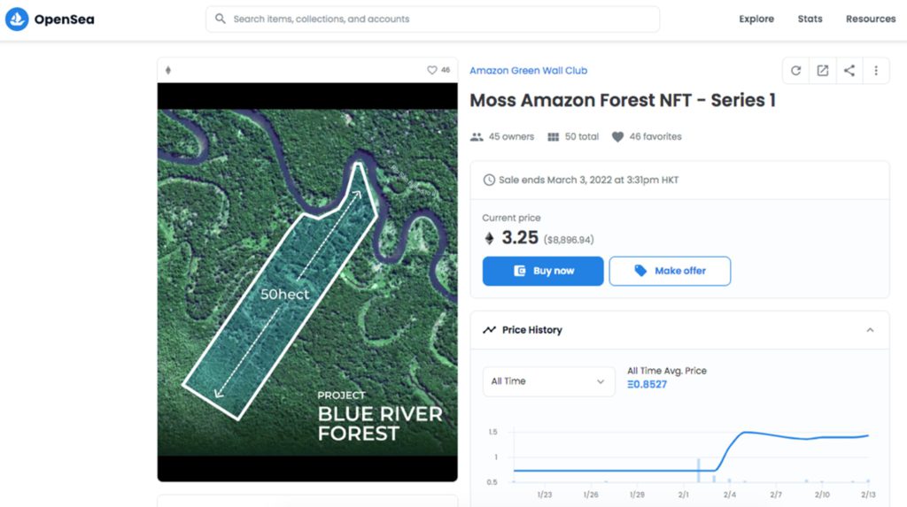 「亞馬遜雨林NFT」針對巴西的土地產權問題,在當地法制外以另類的NFT充當森林的土地產權擁有證明。按照 Moss 的研究,種植1,500 萬公頃的「綠牆(Green Wall)」樹木緩衝區可減慢亞馬遜地區伐林。因此,公司購入綠牆大部分所需的土地,通過 NFT 轉售其中一部分,每個NFT代表一公頃約為一個足球場大小的森林。公司表示出售的森林具良好環境條件和法律保護,每份智能合約皆透過以太坊區塊鏈(Ethereum blockchain)儲存關於財產所有權的信息和數據,資訊高度透明。