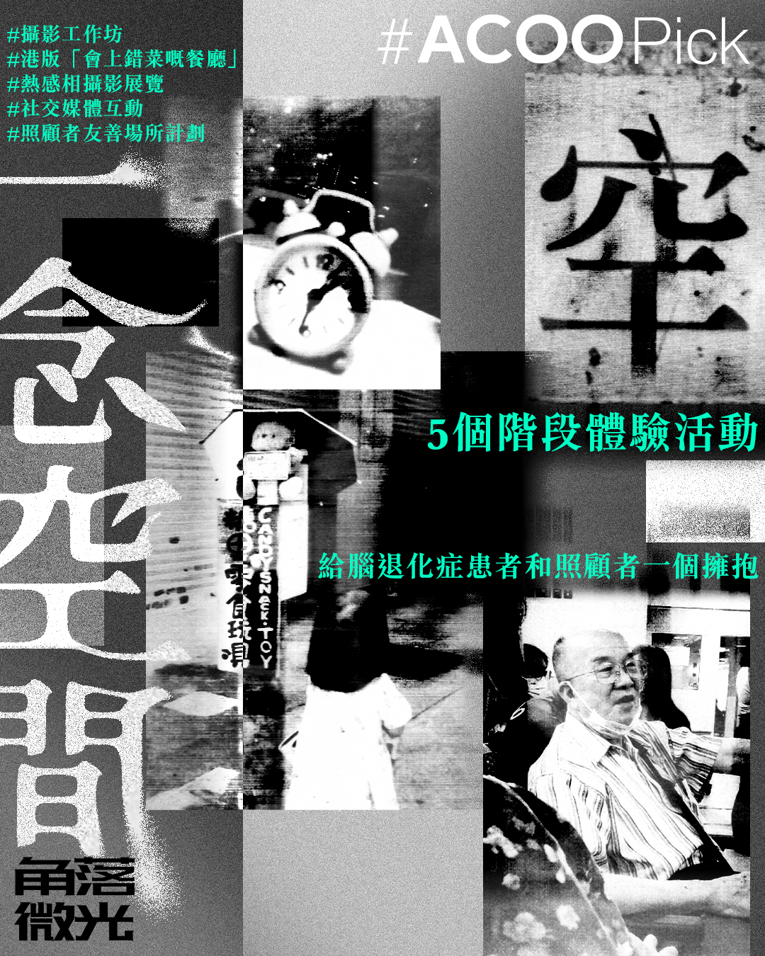 如果我們失去了回憶,人生還剩下甚麼? 一覺醒來,熟悉的人、事、物,在眨眼間全都變得陌生。在這樣的情況下,你可以安心相信身邊的人嗎?一覺醒來,那個和你生活了一生的人,突然忘了所有事,你又能如何自處?志願組織「角落微光」透過「一念空間」社區計劃,以5個階段的體驗活動,邀請腦退化症患者和照顧者,以及每一個觀眾共同參與,感受過他們生活的甜酸苦辣與無奈,亦能從中思考記憶和身份的關係,或許能產生多一份體諒和同理。 攝影工作坊:腦退化症患者及其照顧者一起參與熱感紙相機攝影工作坊。 熱感相攝影展覽:在工作坊的拍攝作品會在展覽中展出,照片特別使用熱感紙,正是代表人的記憶也會隨時間而褪色。 社交媒體:一連5日出post提醒腦退化症年輕化的問題,其實這個病不如你想像的遙遠。 港版「會上錯菜嘅餐廳」:與咖啡店共同製作創意菜式,「錯」又有咩好怕!一起學會欣賞日常的未知,擁抱這些突如其來的美好。 自發照顧者友善場所計劃:每個人都需要一個喘息空間,角落微光找到不同餐廳、cafe、畫廊和社區中心,為照顧者提供一個免費的休息空間,休息過才可以走更長遠的路。同時,現正招募更多空間營造者! 《一念空間》 日期:9月21至29日(9月28日除外) 時間:星期一至五上午9時至下午4時;星期六及日下午1時至9時 地點:上環皇后大道西1號 展覽分享會、以記憶為題及反思自我價值交流活動工作坊 日期:9月23日 時間:下午7時至下午9時30分 日期:9月24日 時間:下午7時至下午9時30分 日期:9月26日 時間:下午7時至下午9時30分