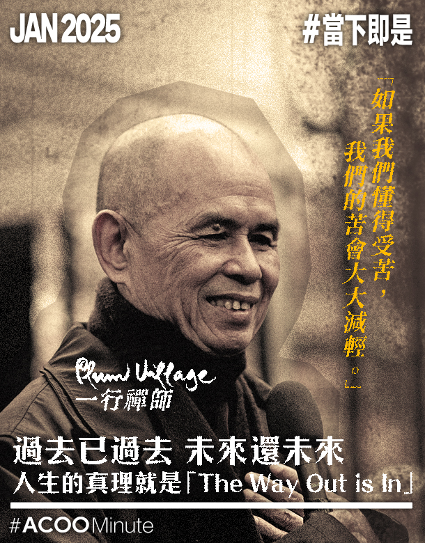 即使你沒有接觸過佛法,也會聽過一行禪師的名字。一行禪師兩年前圓寂,作為全球最具宗教影響力的僧人之一,他的影響力已超越宗教。在書店裡經常看到一行禪師的著作,教我們正念生活。我們喜愛學習一行禪師的智慧,因為如何擺脫痛苦、獲得內心平靜,是很多人希望尋找的答案。 一行禪師出生於越南,16歲出家。當年越戰爆發,眼見人民因為戰爭受苦,他積極投入反戰,在國內公開抗議,又到歐美游說各國協助越南停戰,因此被越南政府拒絕入境,流亡近四十年,直至2005年才獲准回國。他提倡佛教應該入世,積極推動和平,被馬丁路德金提名為諾貝爾和平獎候選人。流亡期間,他將正念修習帶到西方,並在法國成立梅村禪修中心,至今是西方最活躍的佛教道場,每年都吸引來自世界各地的修行者。 經歷過戰亂與流亡,一行禪師對痛苦有深刻體會。眼見國家受戰爭摧殘、親朋在戰火中喪生,加上母親離世,他一度深陷悲傷抑鬱之中。他找到出口的方法,就是透過正念擁抱痛苦。所謂正念,是指專注於當下的每刻,吃飯時吃飯,走路時走路。我們每天都在吃飯走路,但很少有人真正專注地做這些事。而正念就是一種方式,讓我們回到當下,才能感受到當下的美好。我們的腦袋總是停不下來,不是被過去困住,就是擔憂未知的未來,忽略了當下。但過去已過去,未來還未來,唯一能掌握的只有現在。學會正念,就是學會停止盲目的奔跑,回歸當下。 我們想擺脫痛苦,但事實是痛苦是無法避免的。一行禪師曾說:「如果我們懂得受苦,我們的苦會大大減輕。」他比喻幸福喜樂就像蓮花,蓮花的生長需要淤泥,而痛苦就是淤泥。當遇到痛苦時,我們不用急著推開它,可以覺察它的存在,平靜地對痛苦微笑,學會擁抱它,甚至將它轉化。正如禪師所說:「The way out is in」,要找到解脫的出口,就必須向內尋求。 人愈大,比起單純追求快樂,更渴望內心的平靜。有時可能回歸基本,意識到自己擁有的只有當下,好好感受每個珍貴的瞬間,就已能獲得難能可貴的平靜。 文字:林三 @lam.three 設計:Owen @wai.ho.98 圖片來源:Plum Village ——————– In ACOO, you can get refreshed in #ACOOMinute.