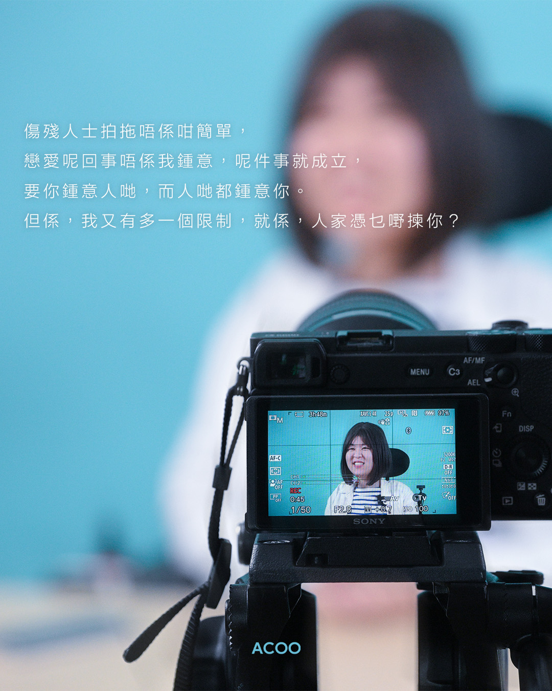那一任男友是一個健全人士,Fish很感恩這個男子明明與自己非親非故,但難得地願意無微不至地照顧她,抱她上下床、推着她的輪椅與她趴趴走。Fish覺得就像偶像劇的女主角一樣被寵上天,連她的父母亦差點要殺雞還神了,「竟然有人鍾意我,又願意照顧我。」但,Fish亦漸漸感受到自己與一般女友的分別,「例如我們去旅行,見到一間網上話好好食嘅餐廳,不過輪椅入唔到去。我都會諗,我係咪陪唔到佢做佢想做嘅東西?