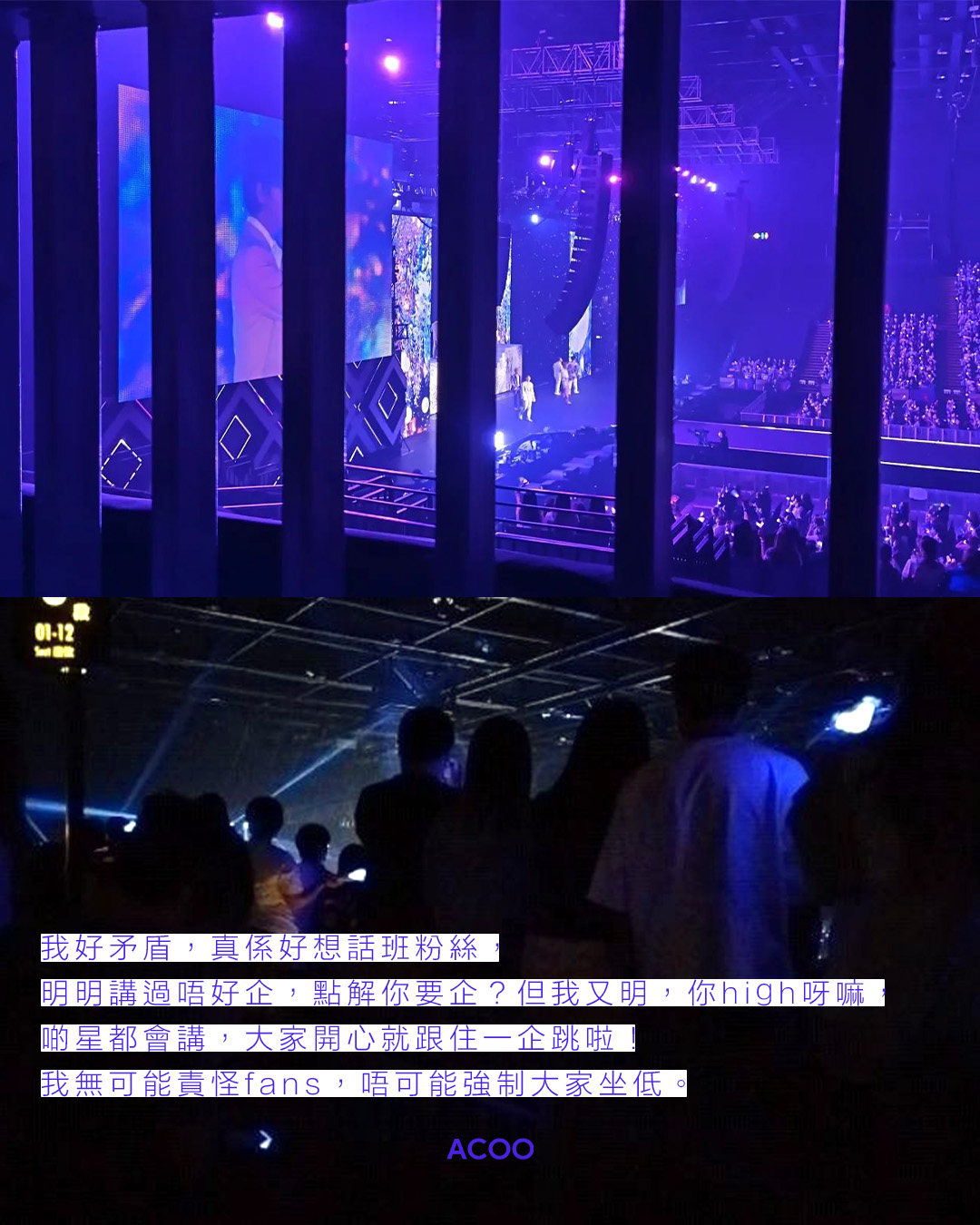 Fish難以解釋她內心的感受,她很生氣,同時又很矛盾。「我真係很想話啲fans,明明講過唔好企,點解你要企?但我又明白,你high呀嘛,啲星都會講,大家開心就跟住一齊跳啦!我無可能責怪fans,唔可能強制大家坐下來。」