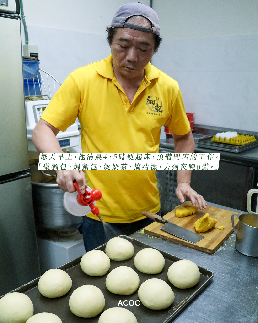 每日清晨4、5時,天還未亮,細哥便已起床,返回店鋪,開始「無嗰樣整嗰樣」——搓包、焗包、沖奶茶、「打餡」一腳踢,「香港人精神?死做爛做囉」。