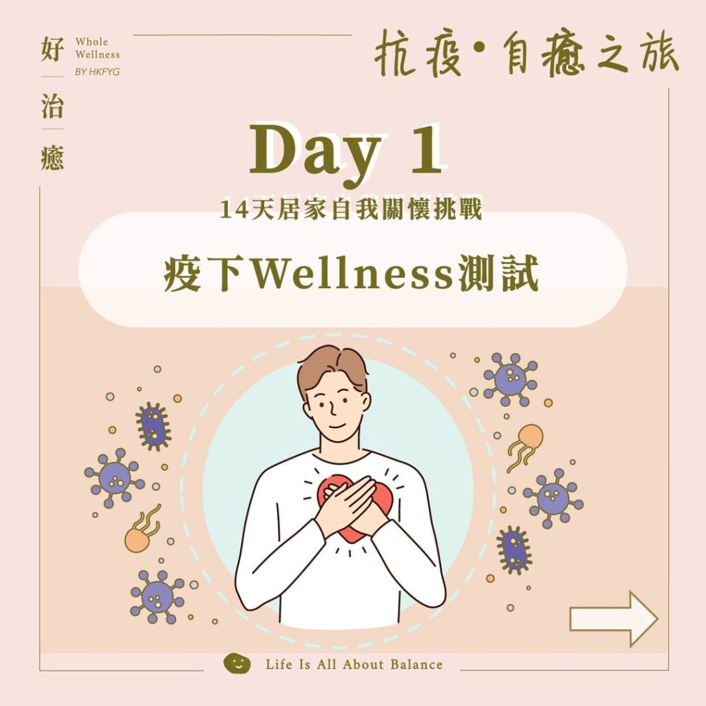 @hkfygwholewellness,好治癒 Whole Wellness 發起的14天線上「抗疫・自癒之旅」挑戰。是以圖文去提供不同資訊,給予大家在家抗疫下可以在不同方面做甚麼的建議。第一天是先完成在身體、心理、社交、職業、數碼及環境健康六方面的測試,好讓大家了解自己現時需要特別關心及改善的部分。接下來的13天就有使用家居用品健身、健康飲食資訊、靜心藝術手作及保持與自然聯繫等的多方面每日「挑戰」。除了跟隨其IG posts 上的資訊去進行挑戰外,更可到其網站訂立更個人化的旅程目標。