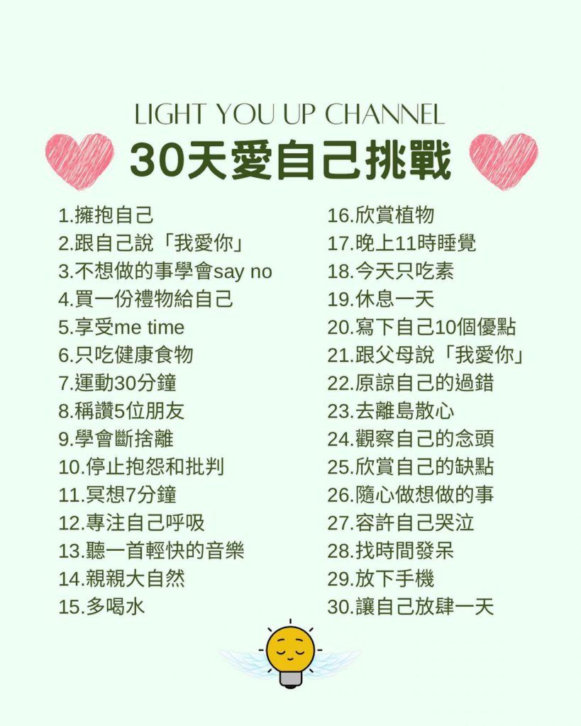 最後是由@lightyouup_channel 製作的「30天愛自己挑戰」。一張圖簡單列出了1至30日,每日要做的一件事。如擁抱自己、稱讚5位朋友及去離島散心等。從自身到他人,更包含外出感受大自然,當中都是相對容易去做的行為。