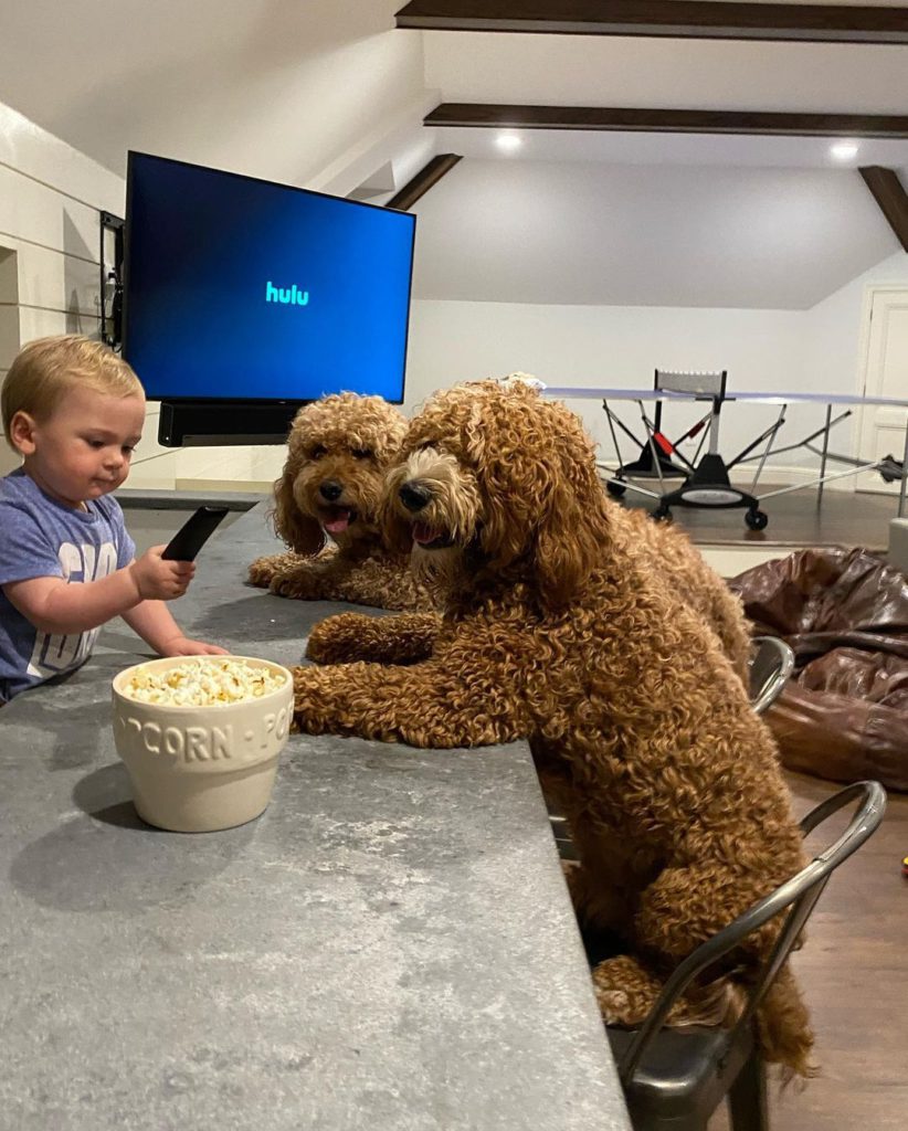 三隻狗狗Samson, Charley及Shea 每天都會倚著Theo睡覺,毛茸茸的手放在他的背上顯得格外窩心。牠們不只善於哄寶寶入睡,更加是一流的「保姆」。每當小孩哭鬧時,狗狗就會跑去抱著弟弟,令他的情緒回復平靜。狗狗與小朋友的感情十分要好,他們不止會一起睡午覺,還一起讀書、散步、看海、進食……