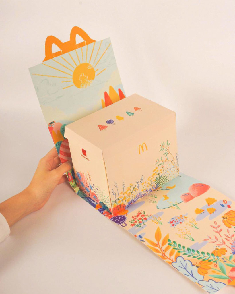 嫌麥當勞開心樂園餐未夠開心?馬來西亞一位設計系學生 Regina 便設計了「更開心樂園餐」Happier Meal。她留意到,現有的兒童餐盒不夠位一次過放置食物和飲品,從而產生了很多非必要的一次性包裝。為了有一個更環保的方案,她親自設計的概念餐盒省卻所有塑膠包裝和玩具,小小的盒子可以放齊食物、飲品,和木製玩具。外觀則以清新的植物、花卉為主,希望小朋友會從中發現大自然的美。