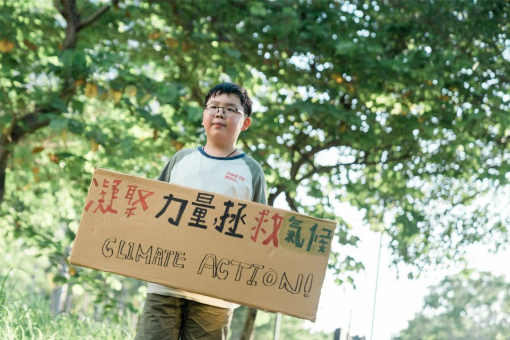劉衍一和他自製的氣候倡議紙牌。Source: © Patrick Cho/Greenpeace