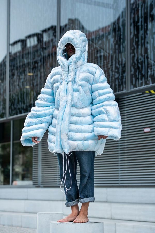 意大利設計師Tobia Zambotti在冰島收集了近1500個口罩,再用臭氧徹底消毒一個月。之後他把口罩送給芬蘭時裝設計學生 Aleksi Saastamoinen,作為製作口罩羽絨的「原材料」。淺藍色的羽絨加上蓬鬆設計看似十分暖和,更有防水功能。Tobia希望透過這件「Coat-19」讓市民看到由口罩衍生的污染情況。Zambotti認為大眾經常把「環保」、「可持續性」掛在口邊,但還是會選擇用一次性口罩。同一情況也適用於時裝文化:市場傾向用最快捷及便宜的解決方法,導致嚴重環境污染。